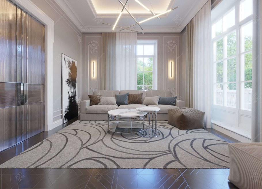 Гостиная с 2 окнами на одной стене с акцентной стеной за диваном