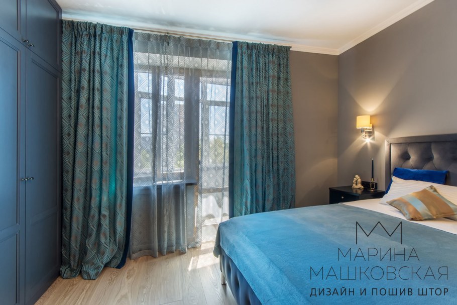 Бирюзовые шторы в интерьере спальни