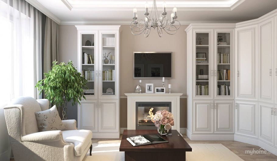 Гостиная с камином в классическом стиле в светлых тонах в интерьере (43 фото)