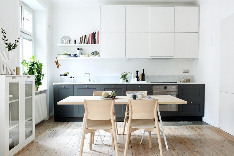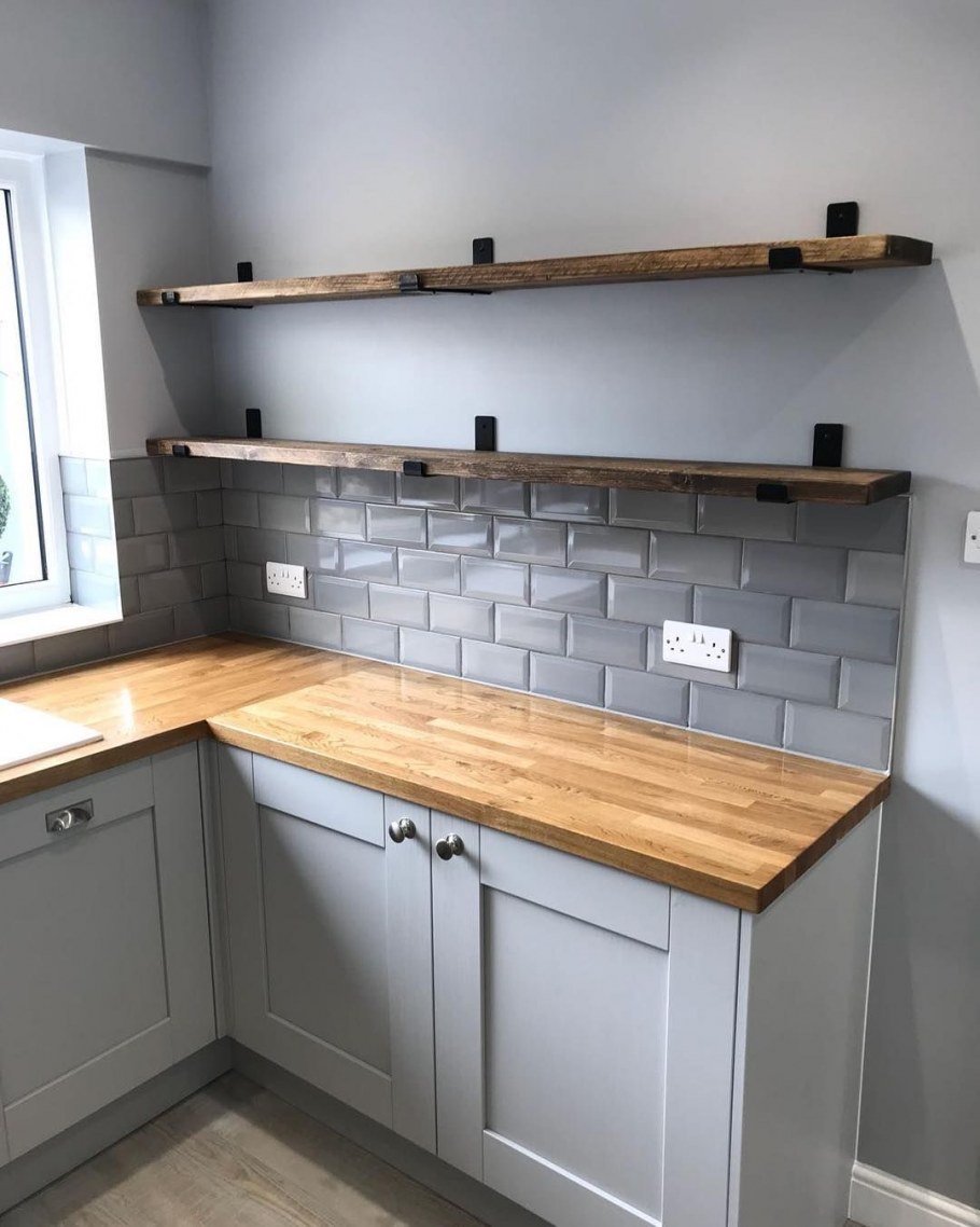 Серая кухня икеа с деревянной столешницей в интерьере (50 фото)