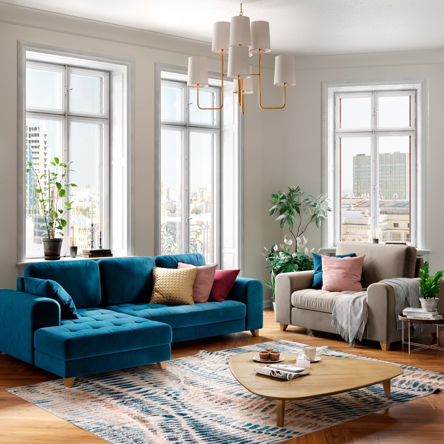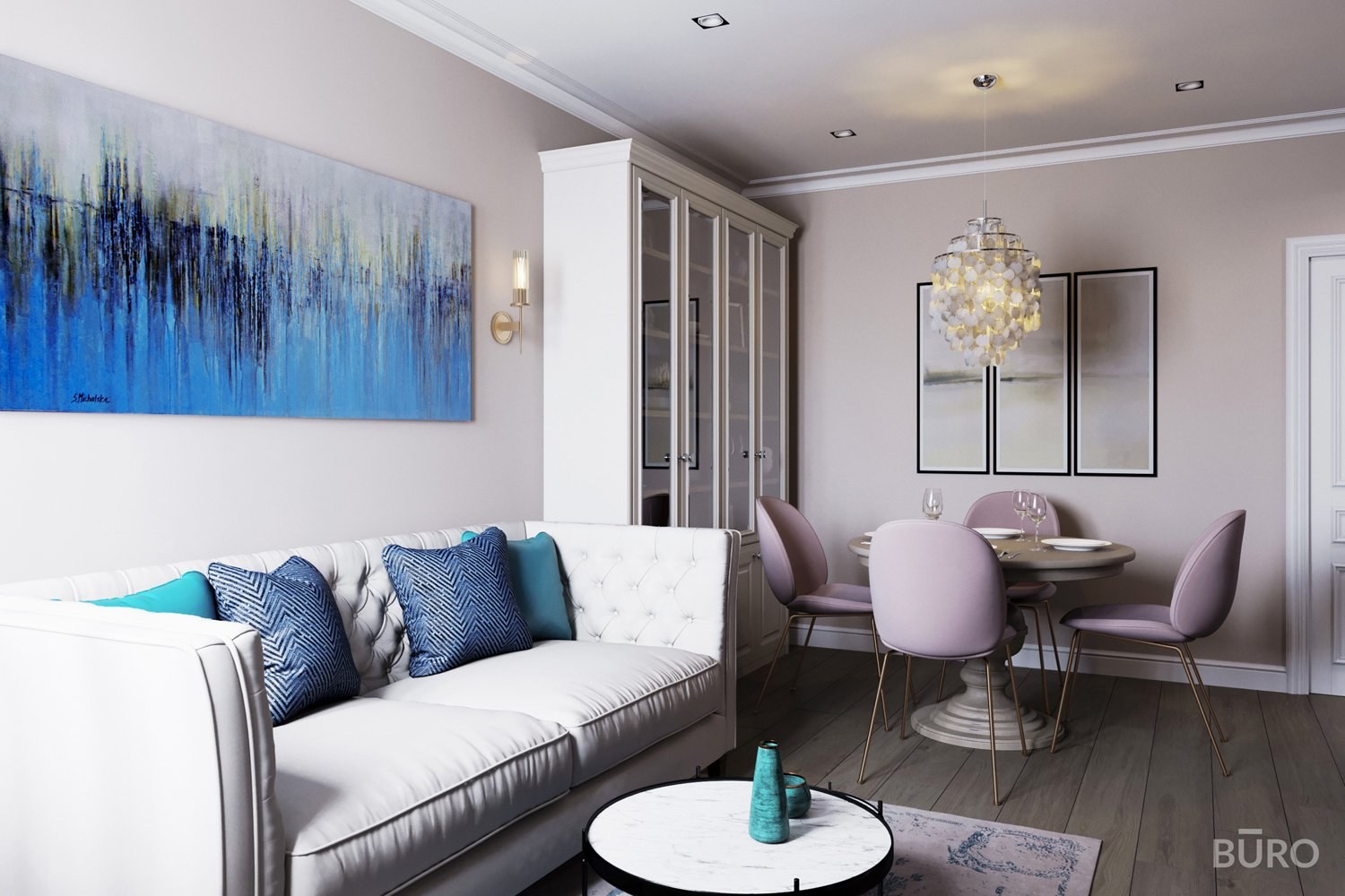 Гостиная в стиле Сканди в голубых и бежевых тонах