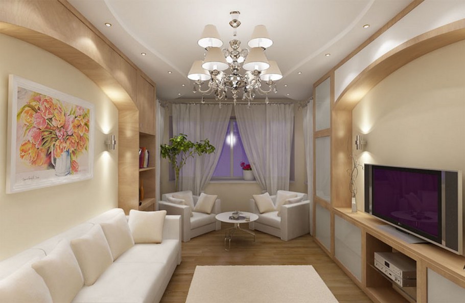 Интерьер узкой гостиной