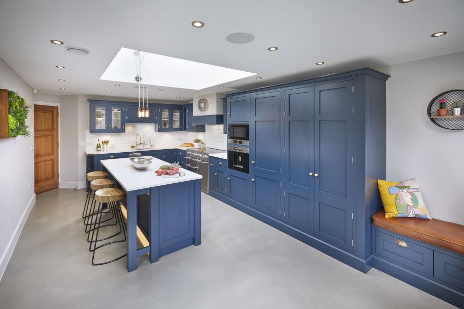 Синяя кухня с деревянной столешницей в интерьере (42 фото)