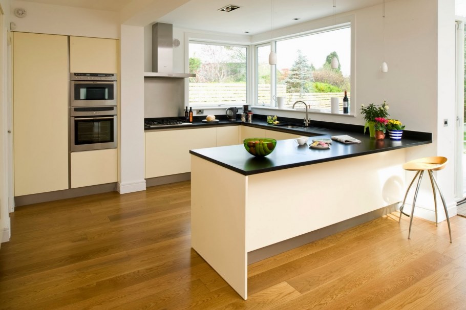 Бежевая кухня с деревянной столешницей в интерьере (41 фото)