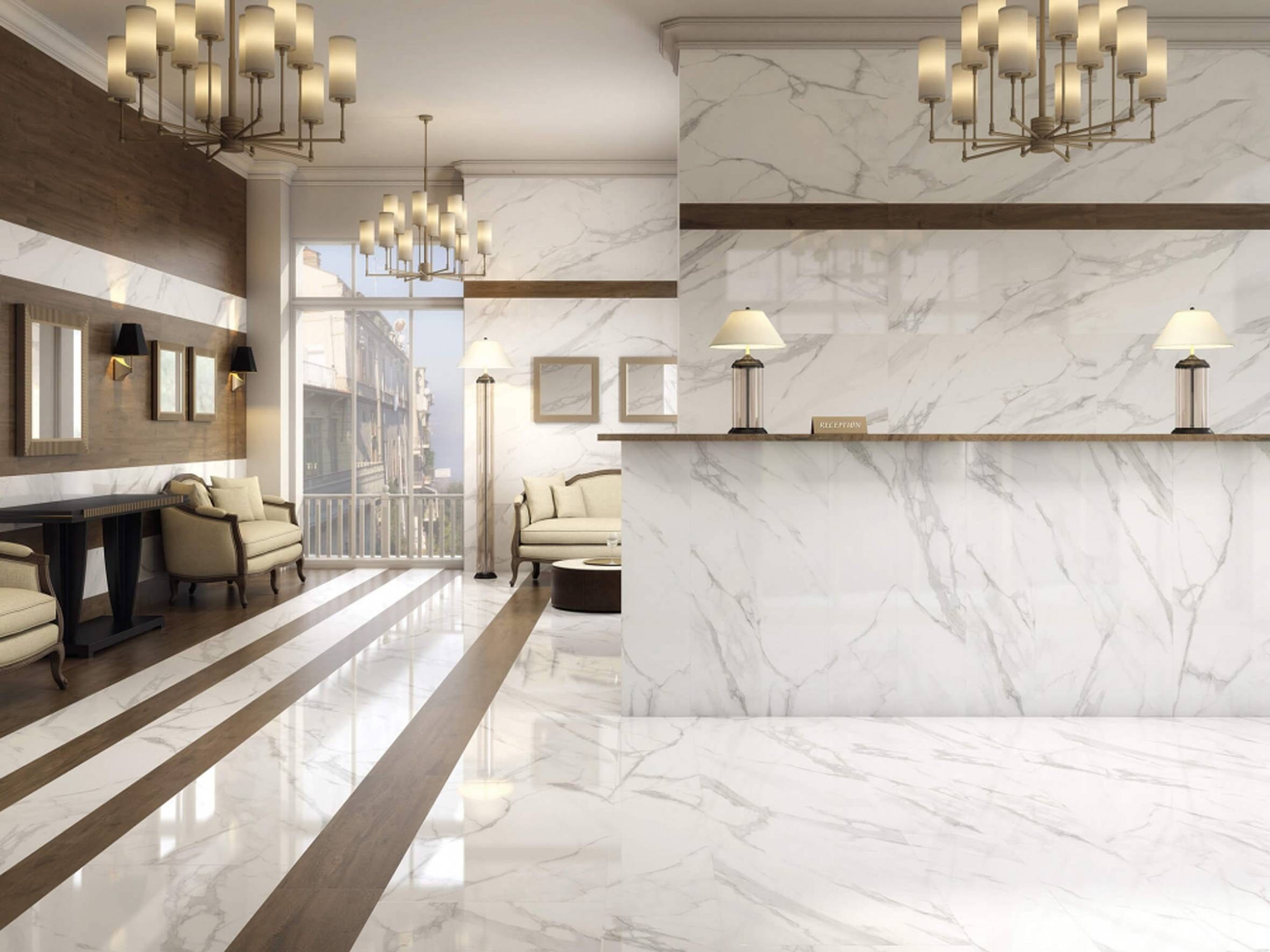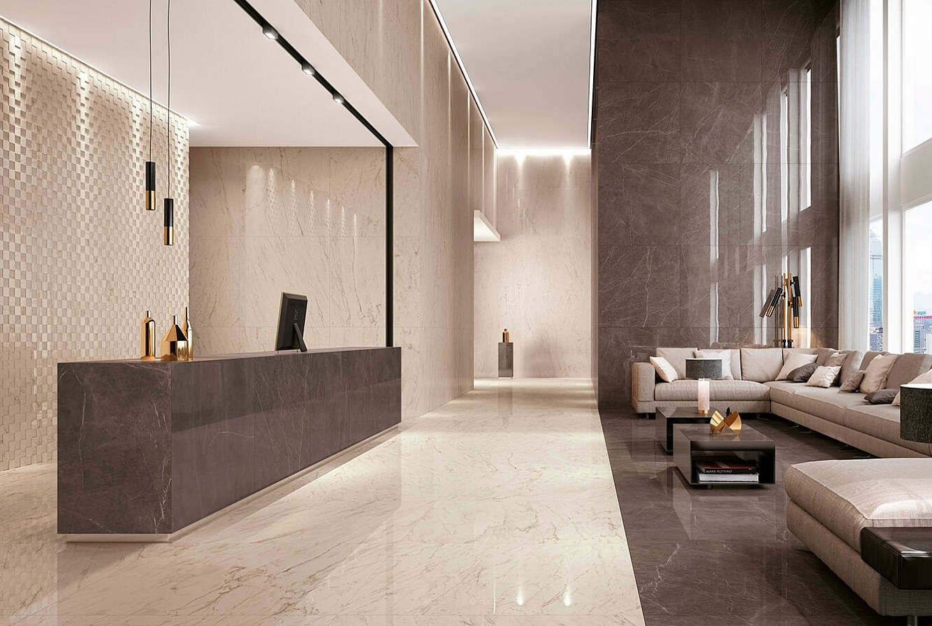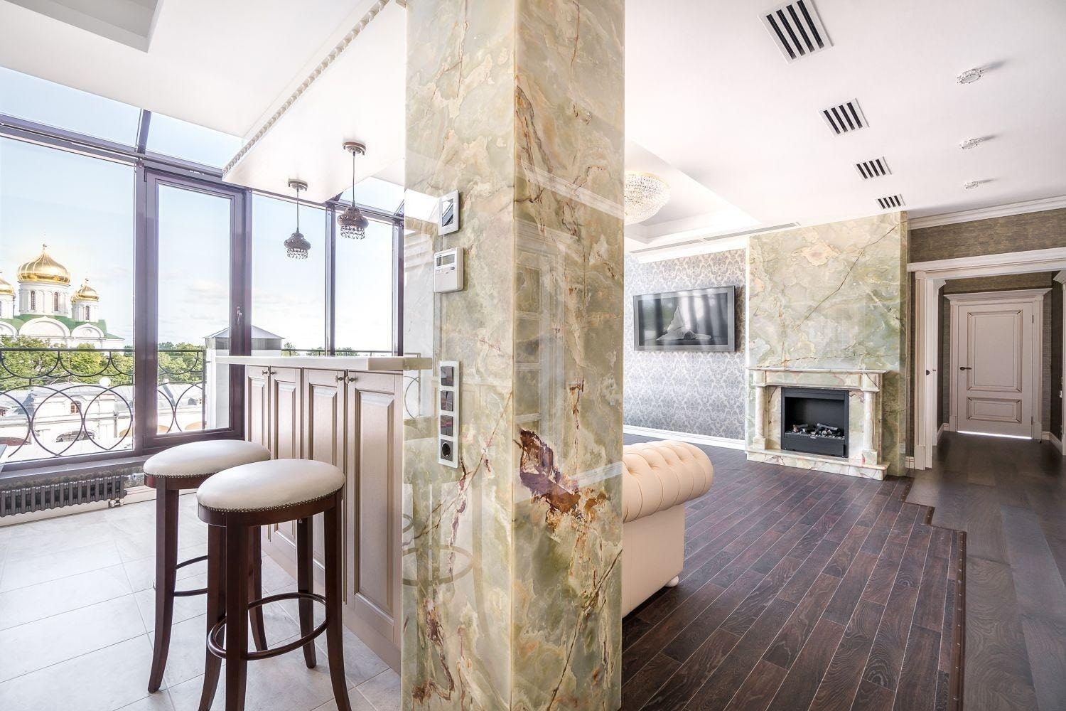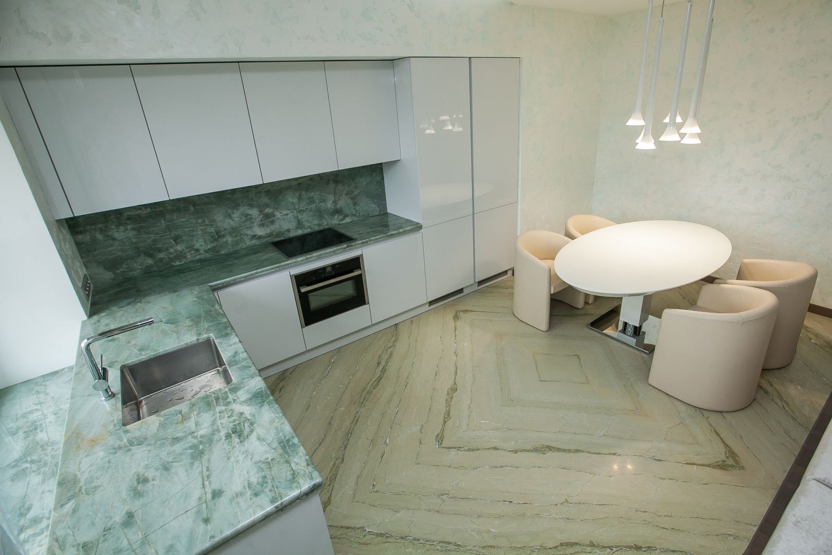 Дизайн однокомнатной квартиры с мраморной напольной плиткой (46 фото)