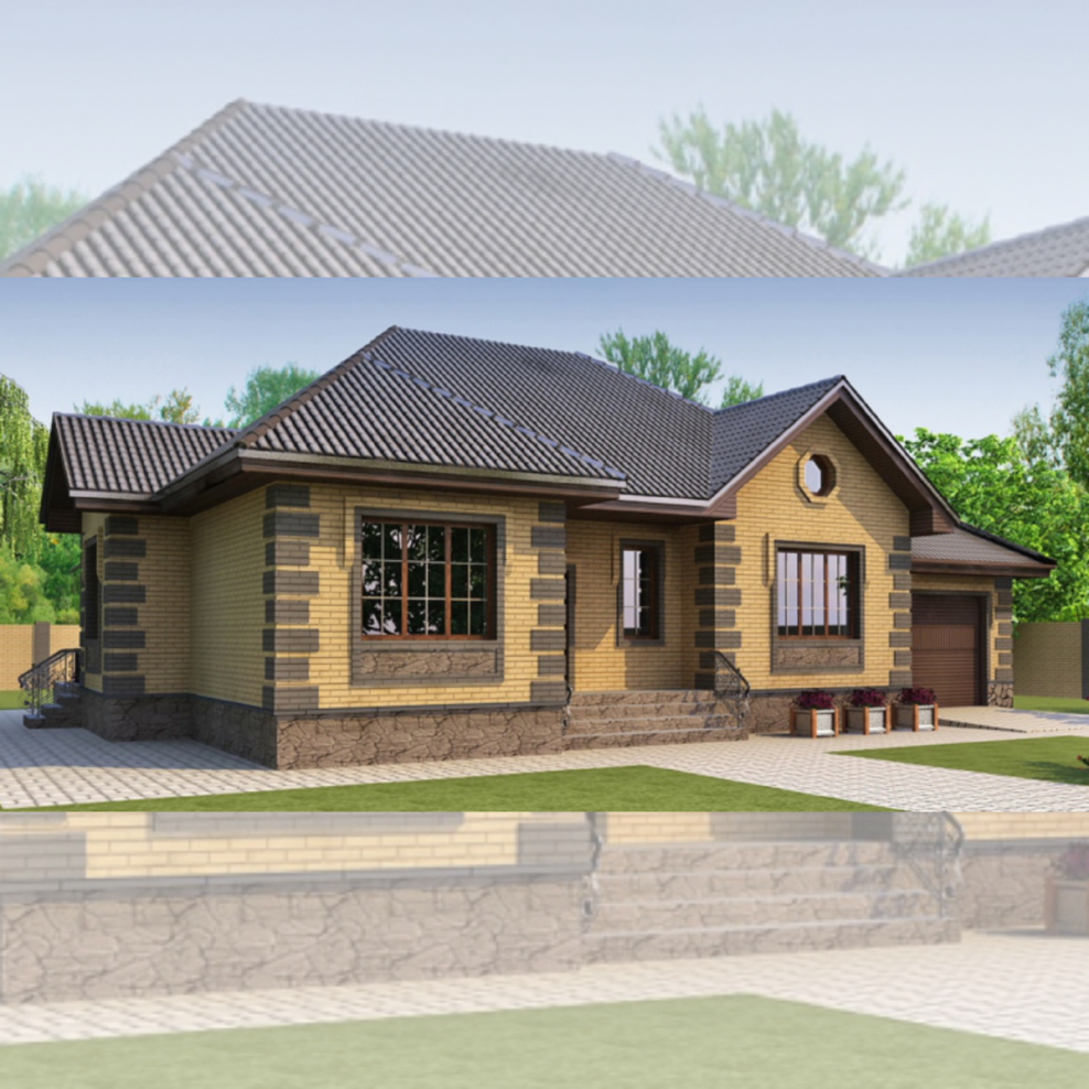 Одноэтажный дом с четырехскатной крышей и гаражом