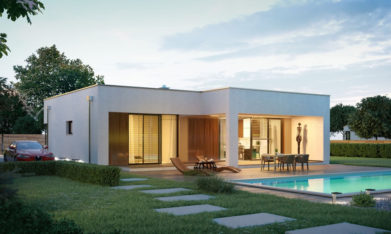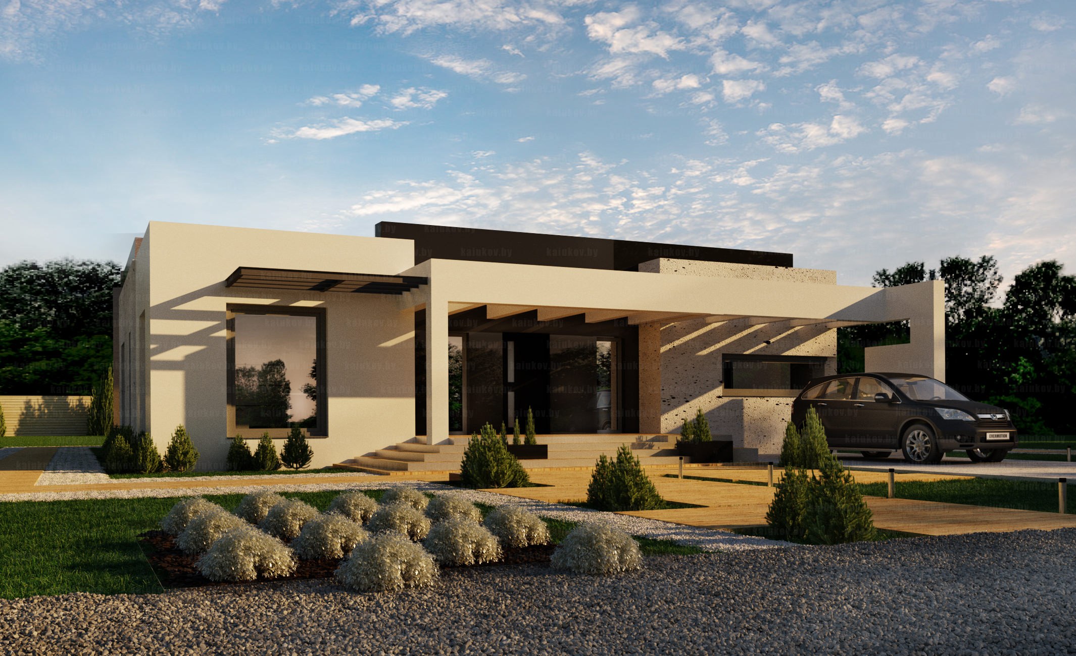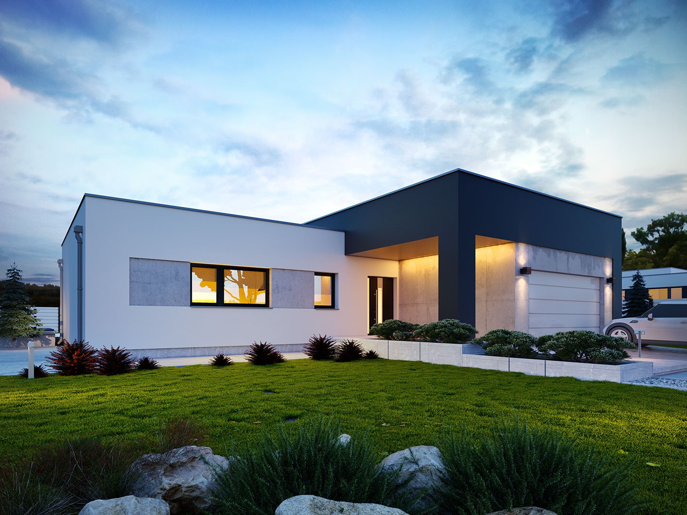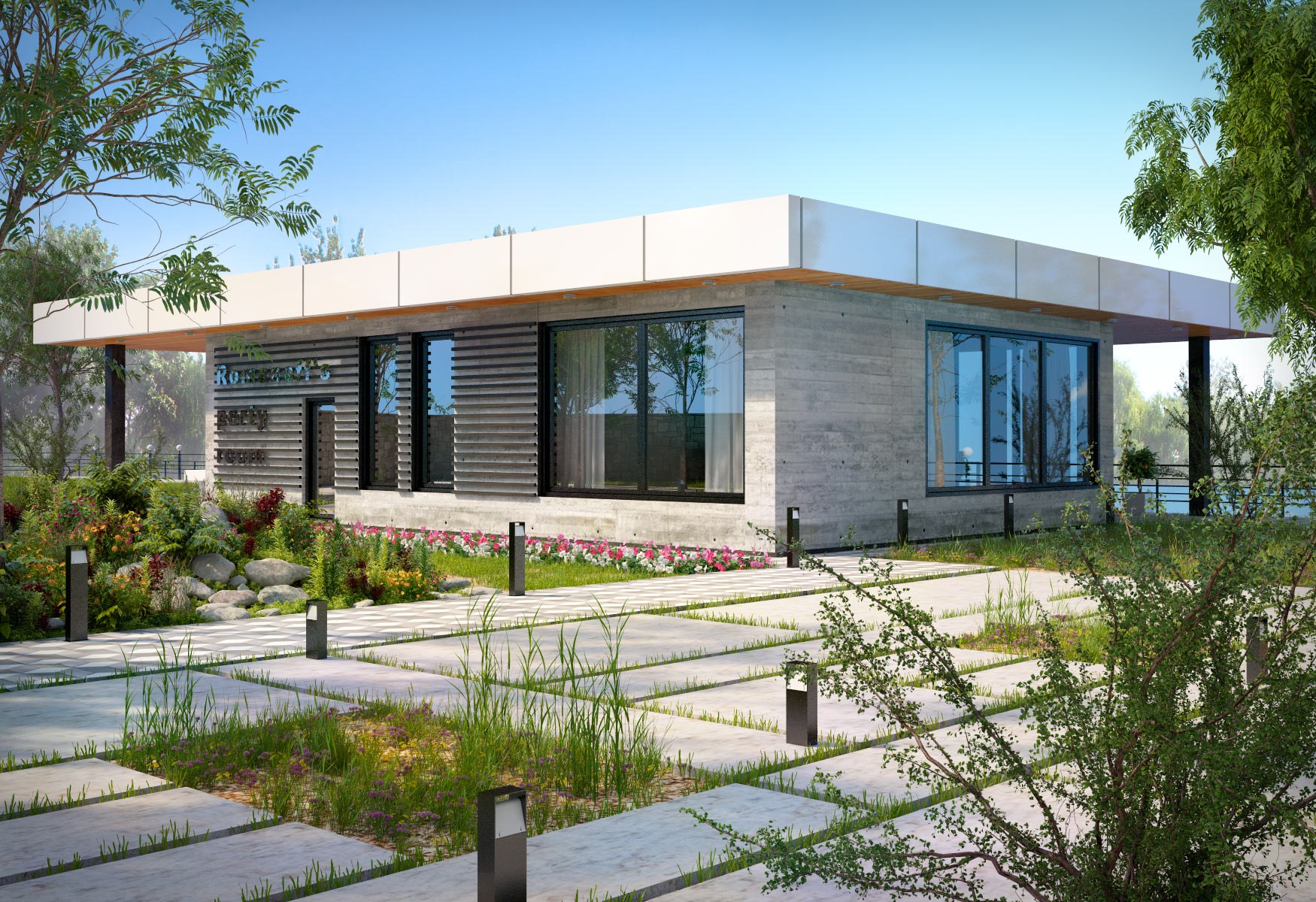 Одноэтажный дом с плоской крышей и гаражом