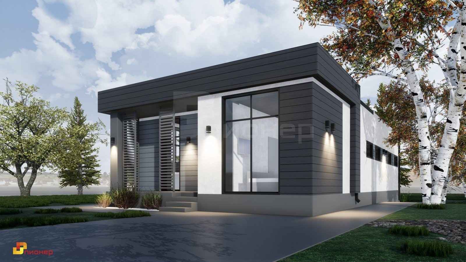 Одноэтажный дом в стиле Минимализм с двухскатной крышей