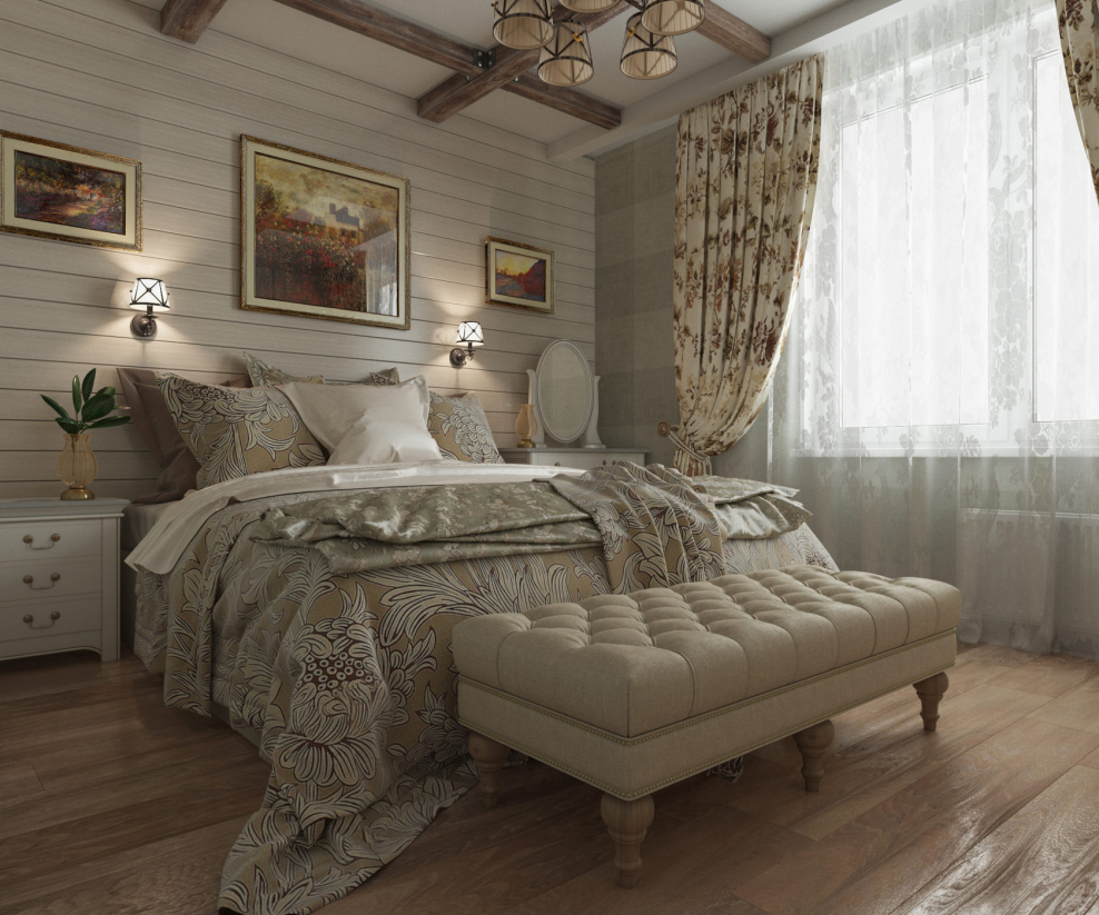 Дизайн спальни в стиле Прованс с ламинатом на стенах