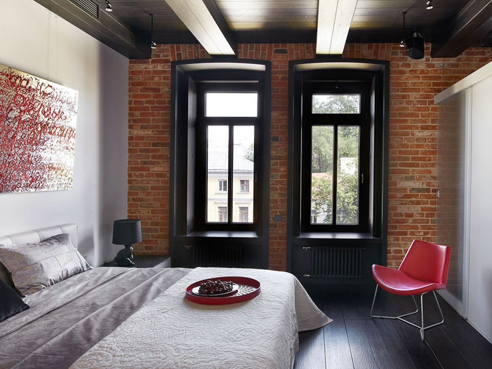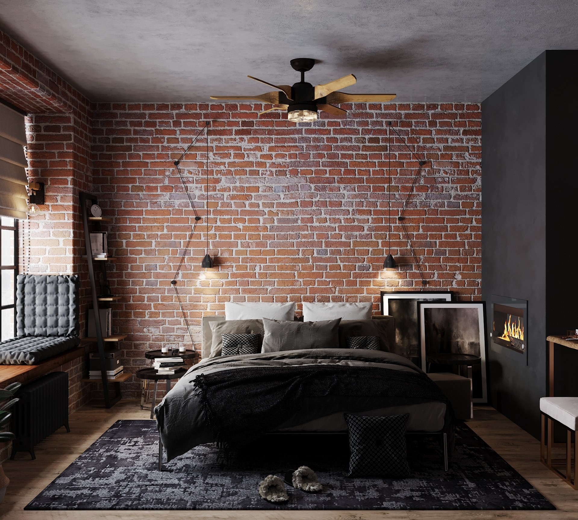 Спальня в стиле лофт с кирпичной стеной