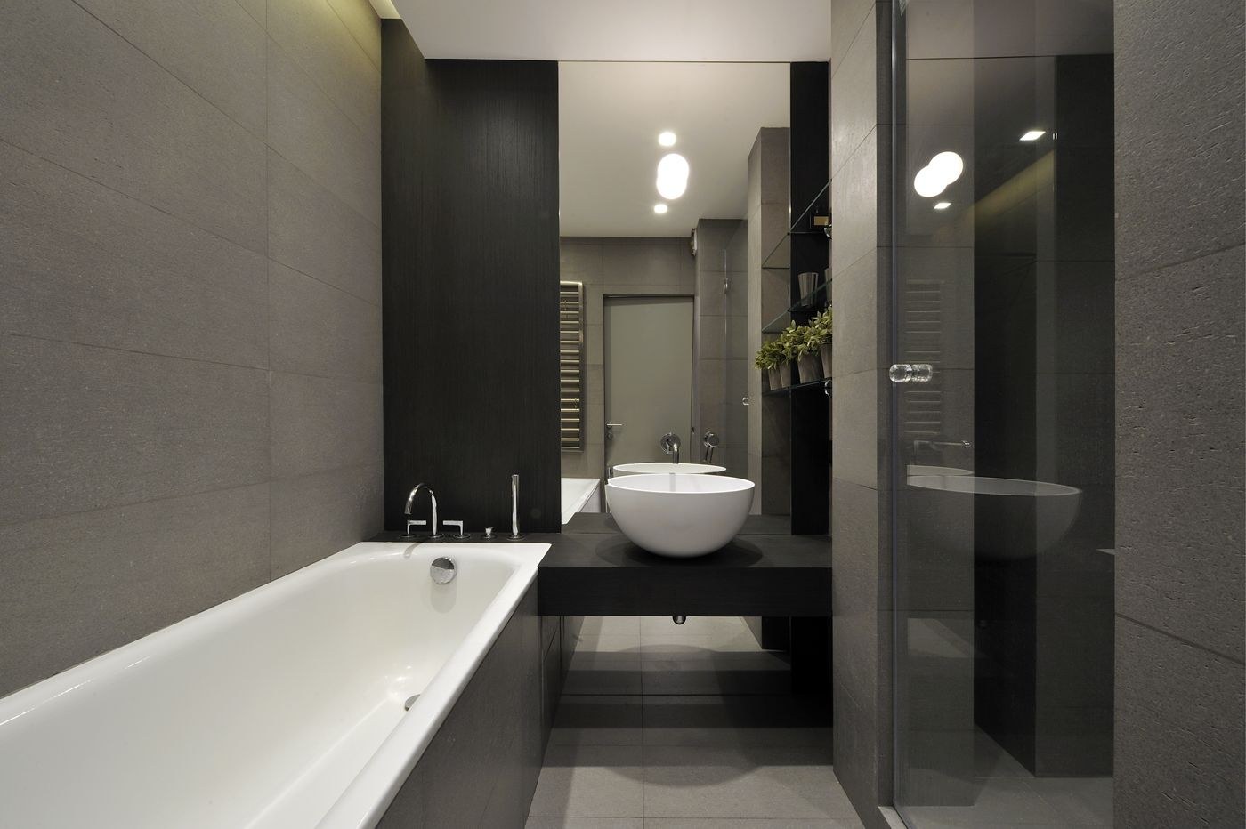 Интерьер большой ванной комнаты в серых тонах
