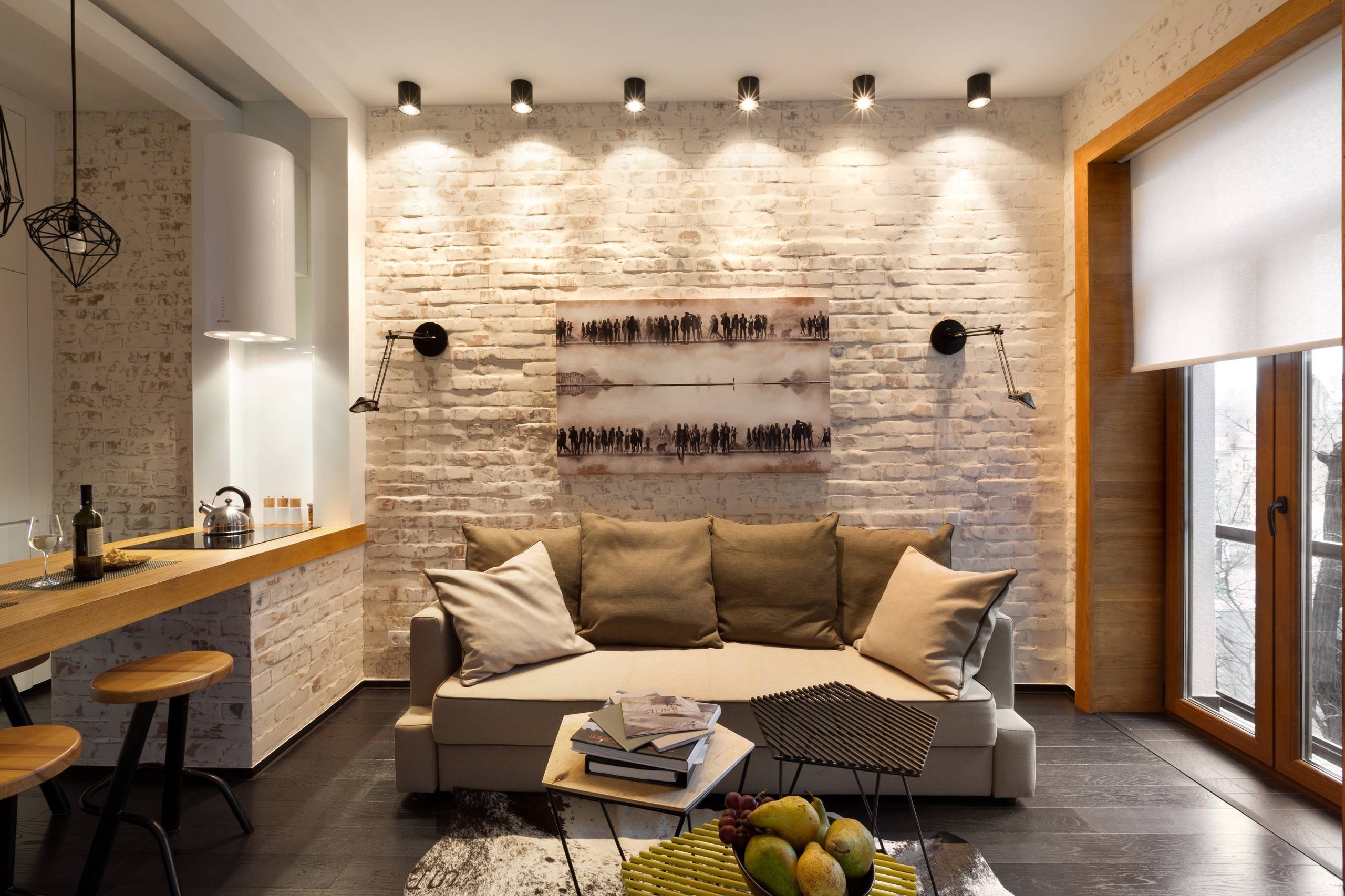 Гостиная с белым кирпичом