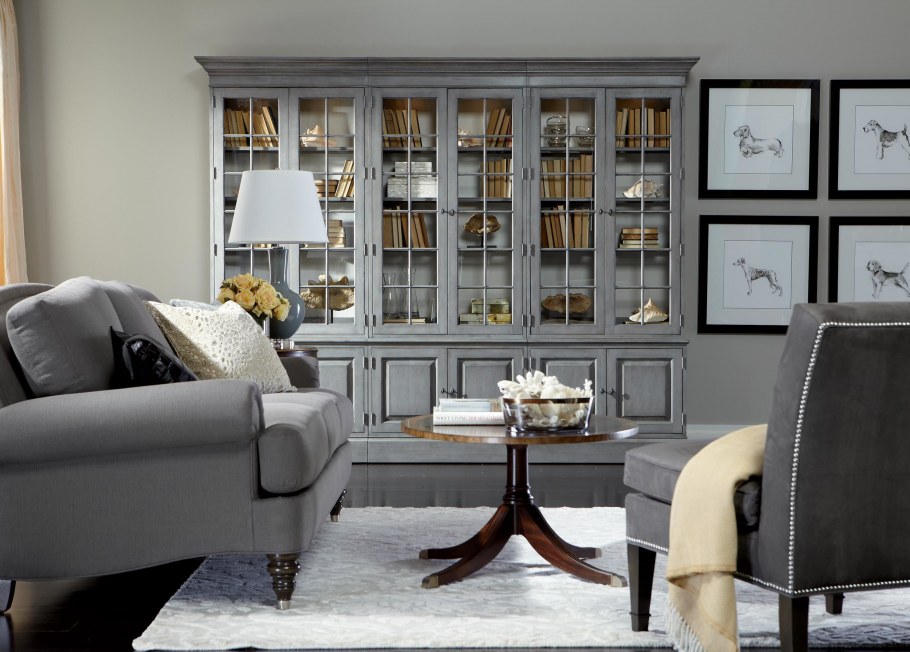 Книжные шкафы в интерьере гостиной неоклассика (58 фото)
