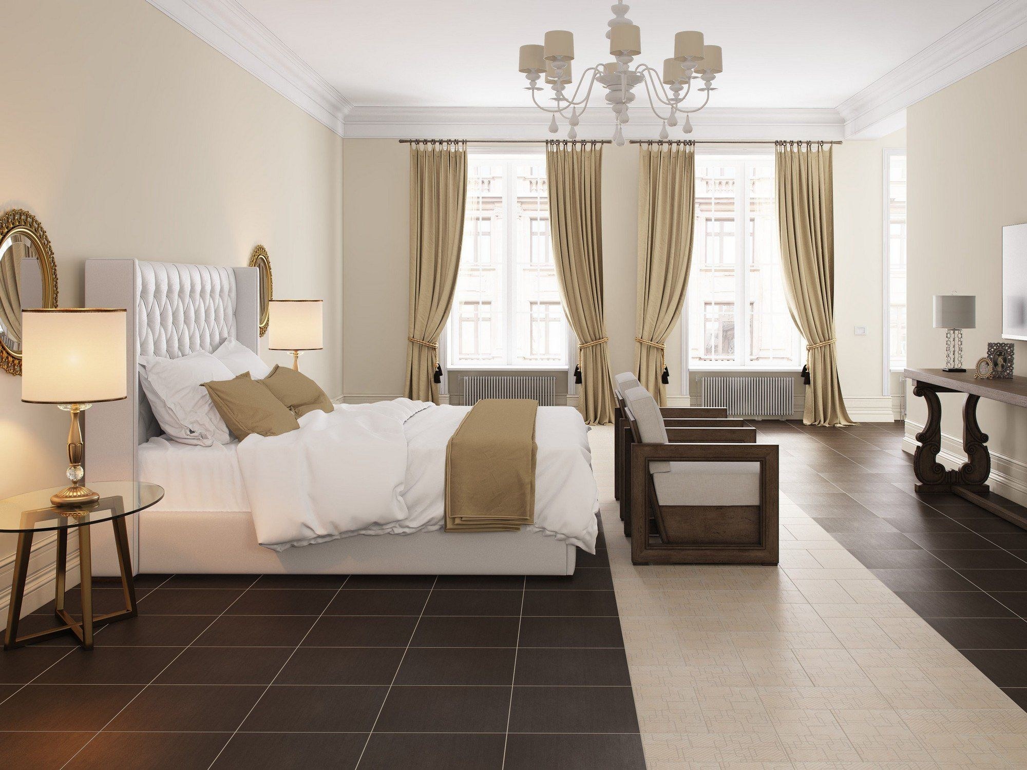 Серый пол и бежевая мебель