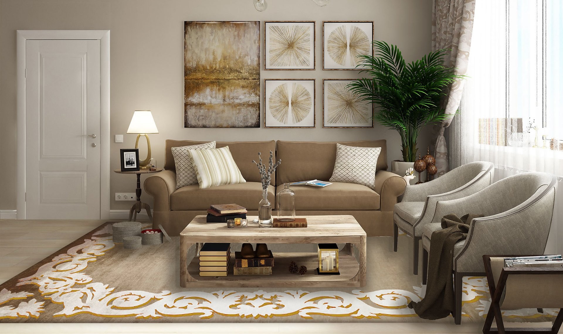 Коричневый ковер в интерьере гостиной