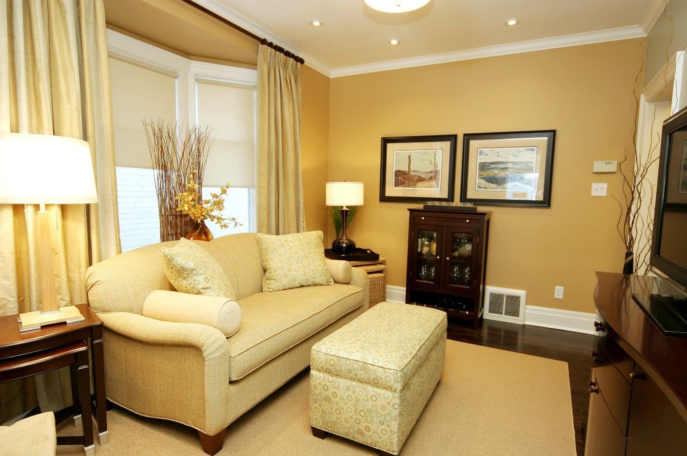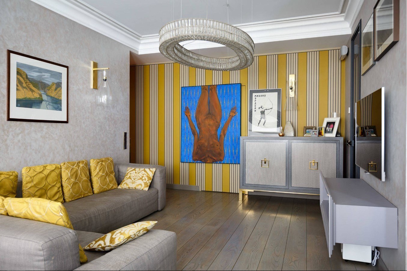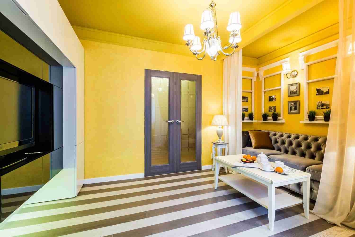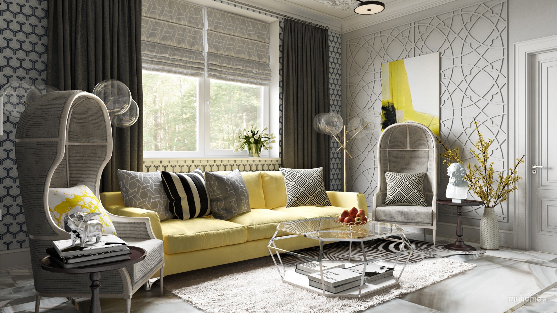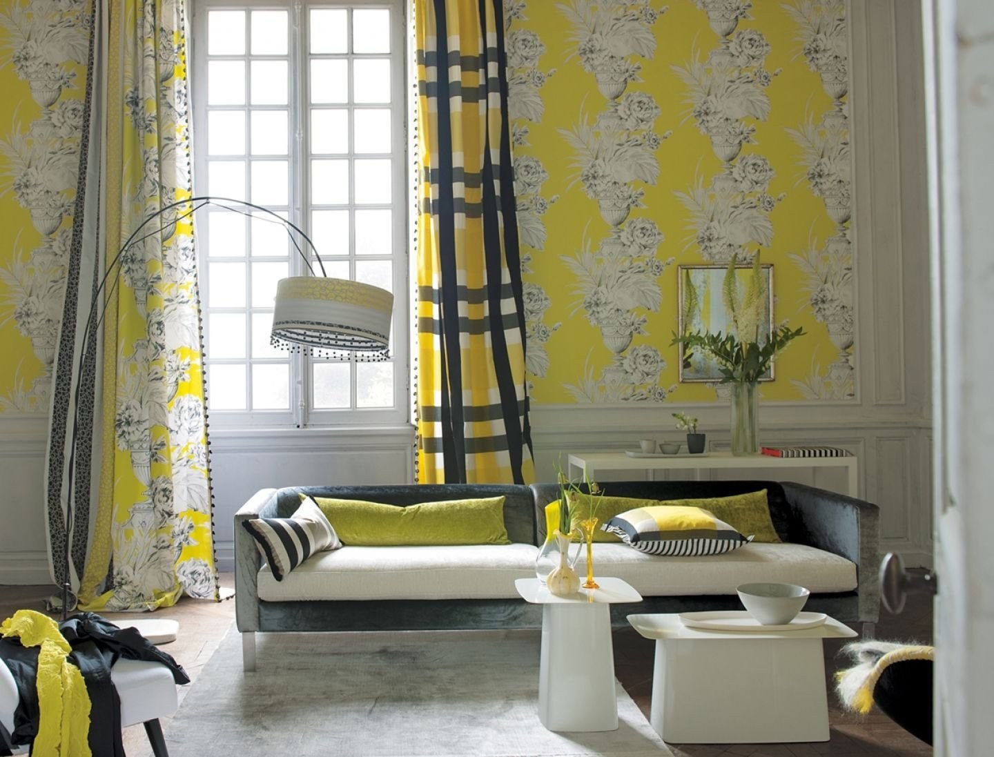Обои под желтую мебель в гостиную в интерьере (61 фото)