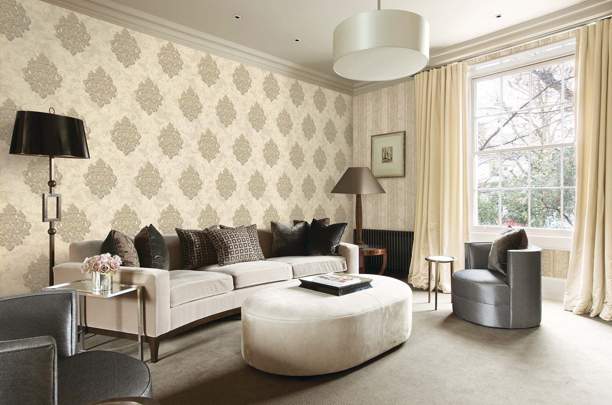 Обои с вензелями в интерьере гостиной светлые