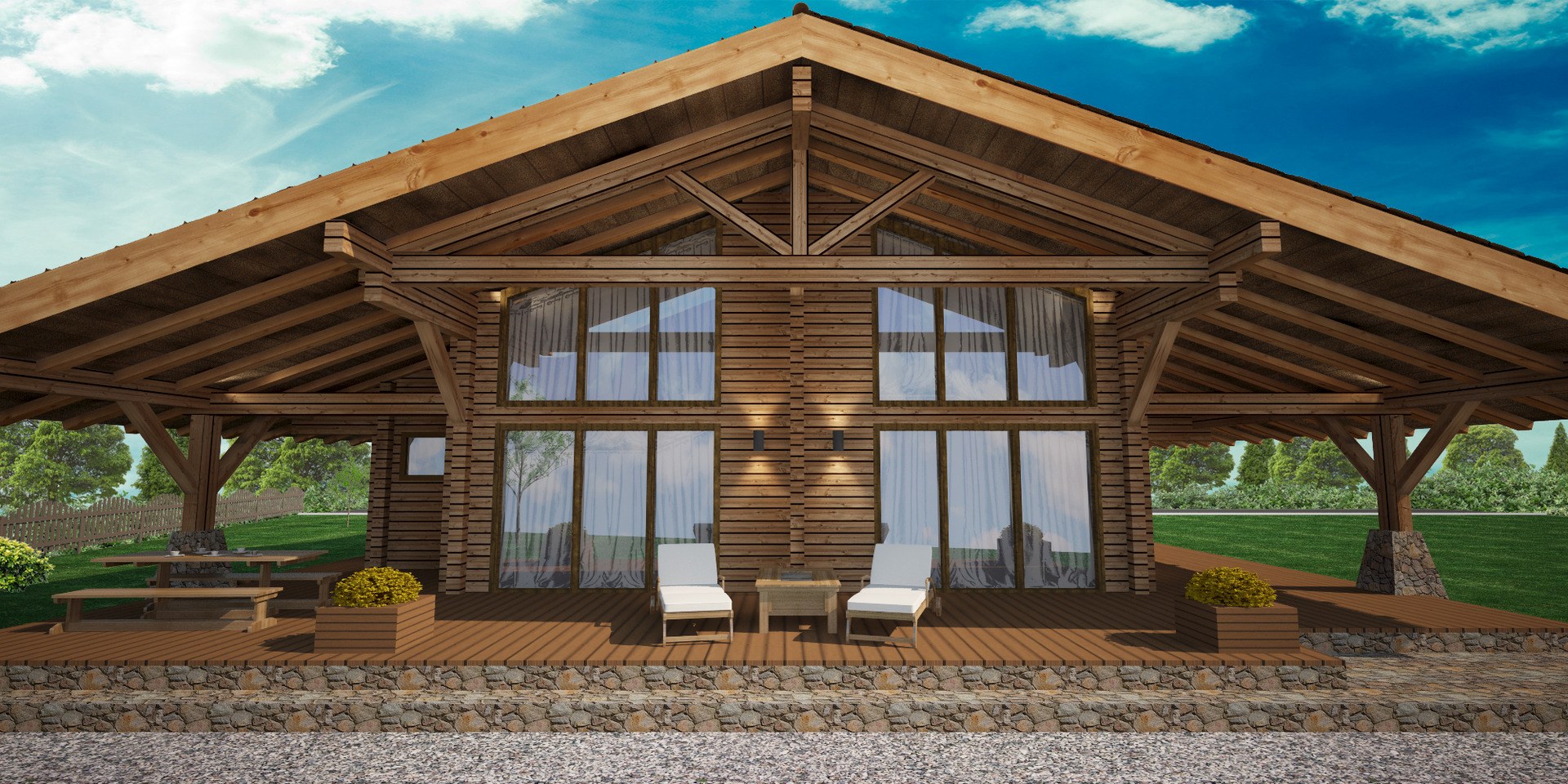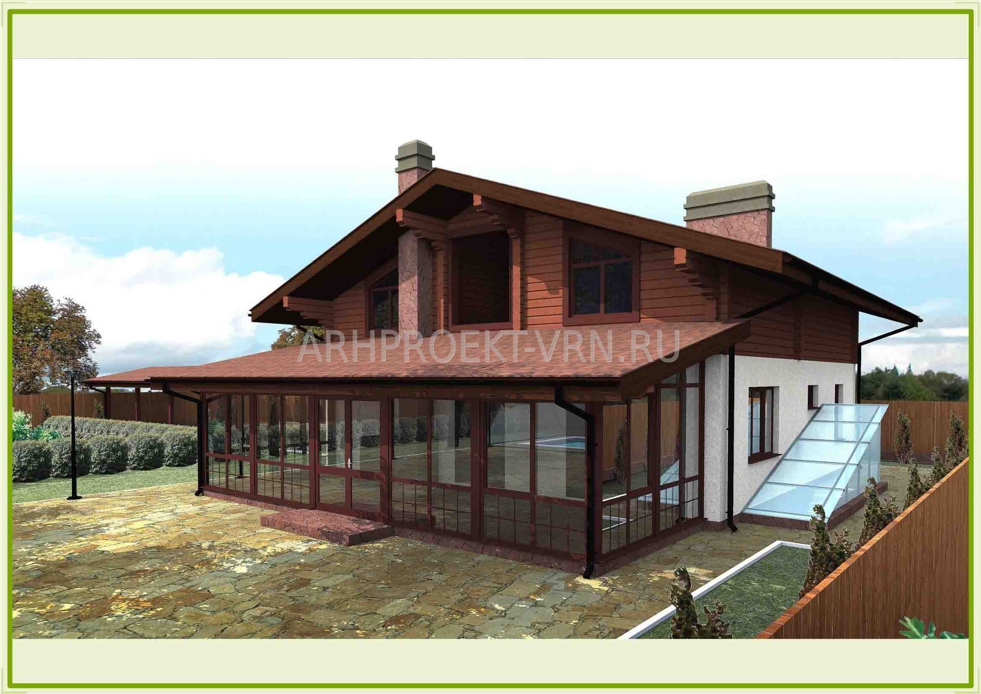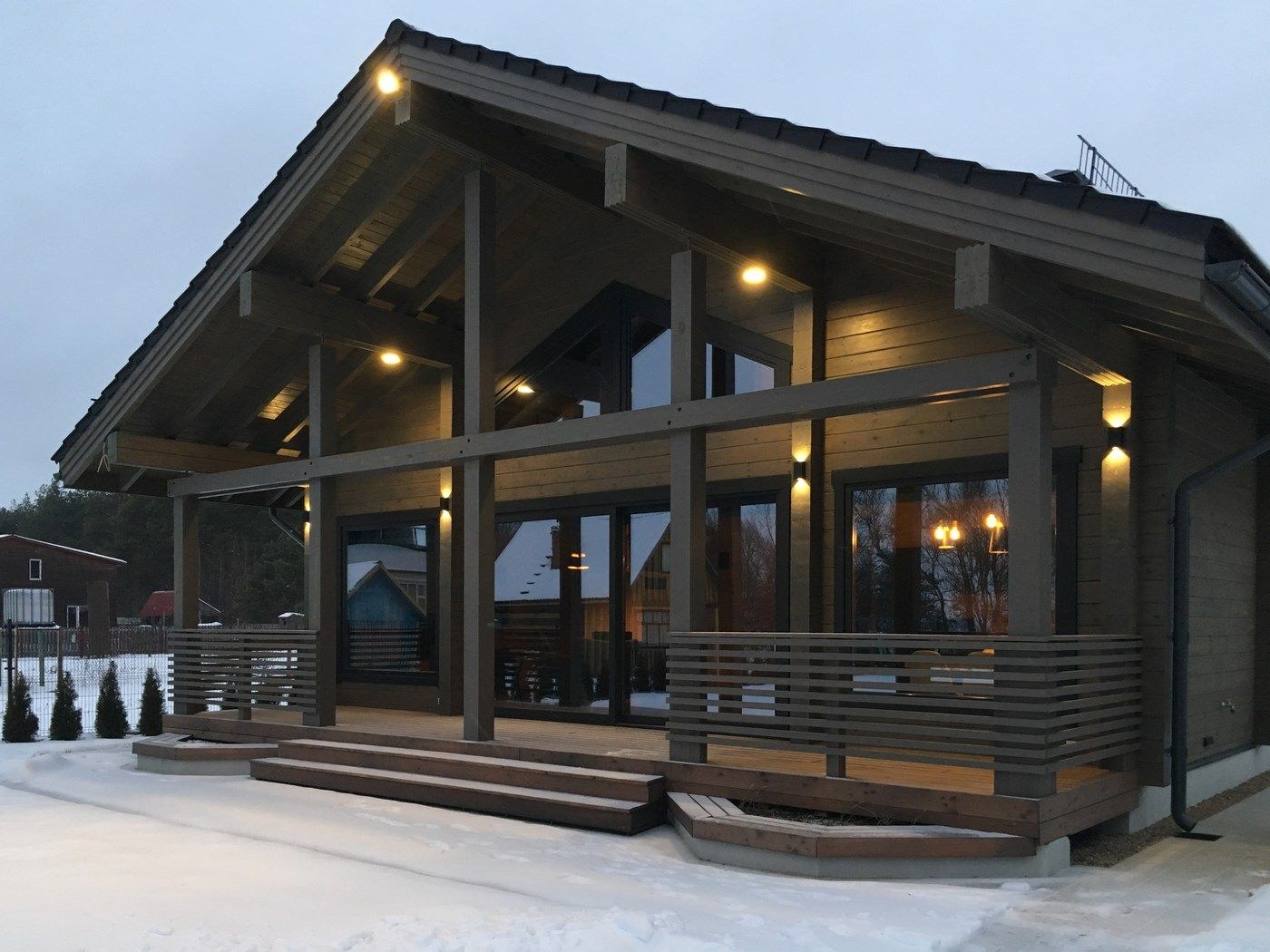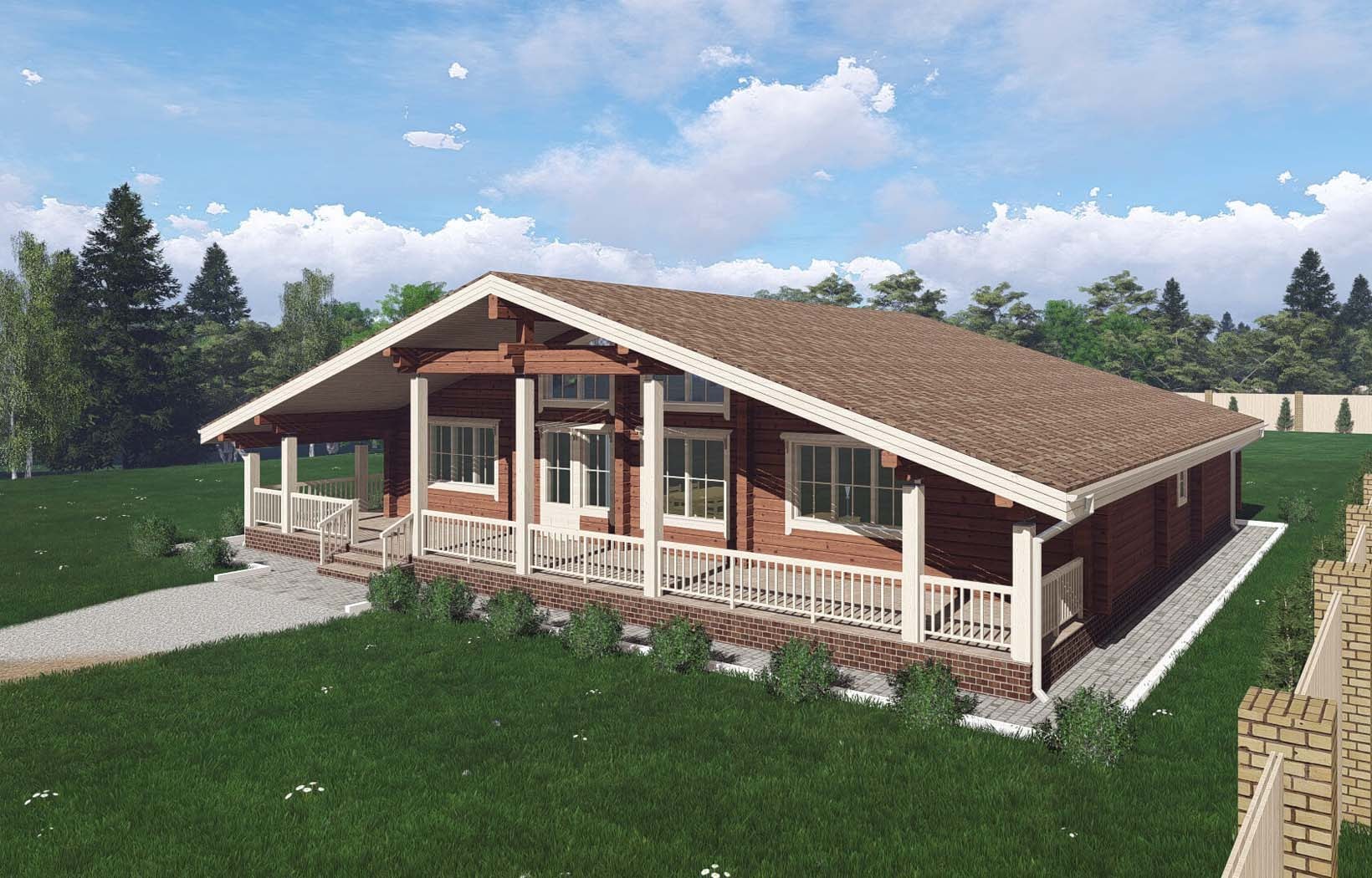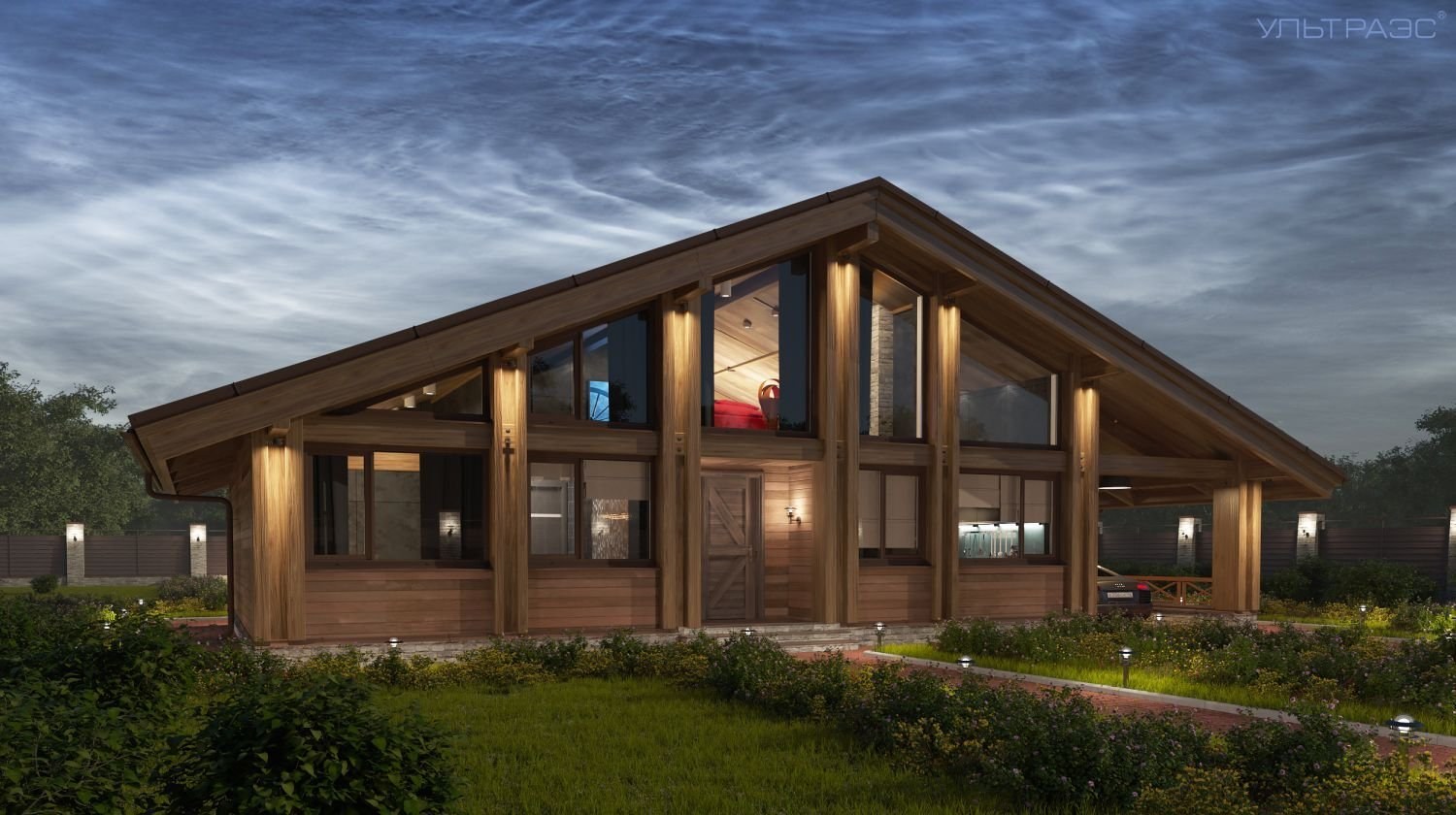 Деревянный дом с террасой под одной крышей