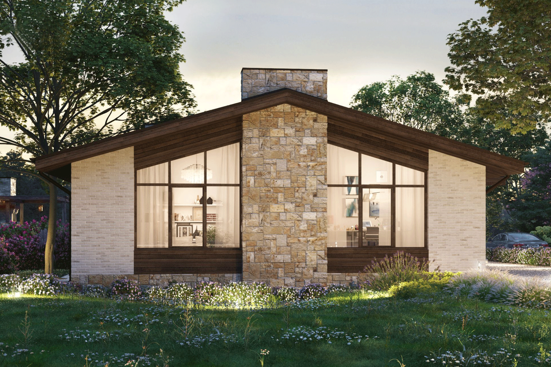 Дом с двускатной крышей и панорамными окнами