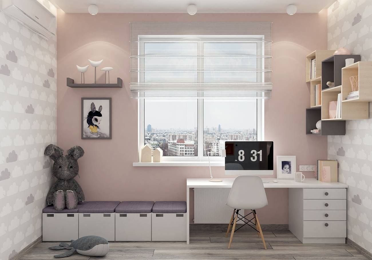 Интерьер детской комнаты 15 кв.м стол подоконник