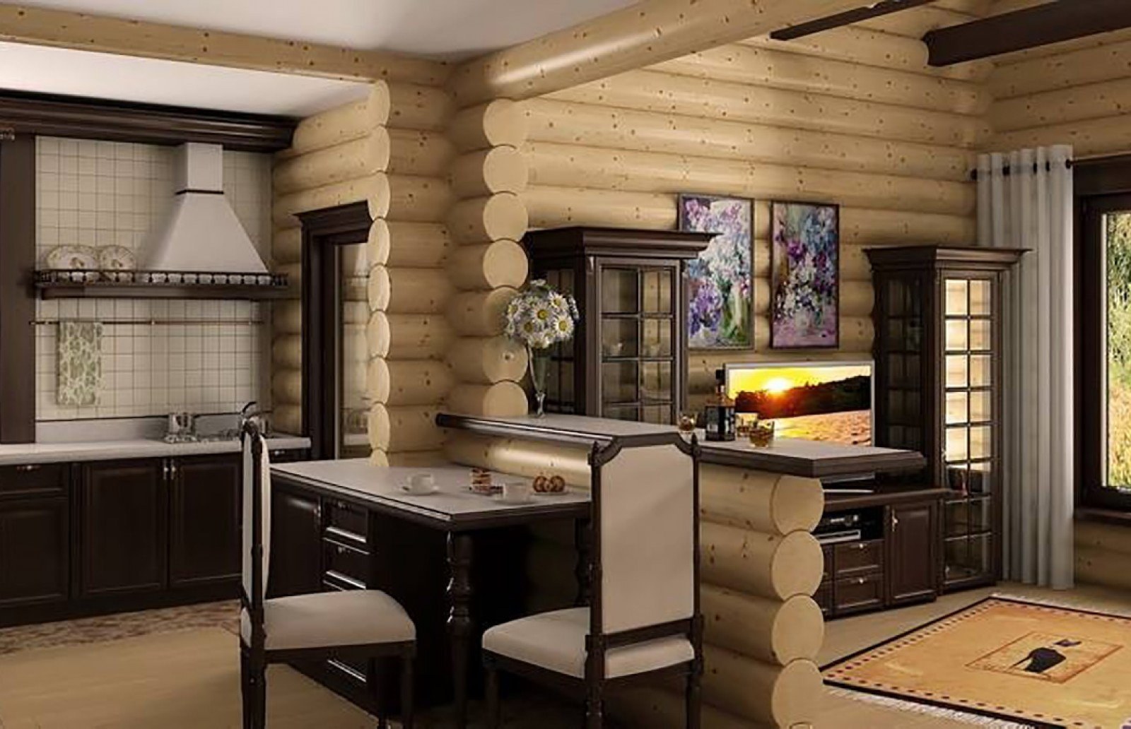 Дом из оцилиндрованного бревна интерьер кухня гостиная