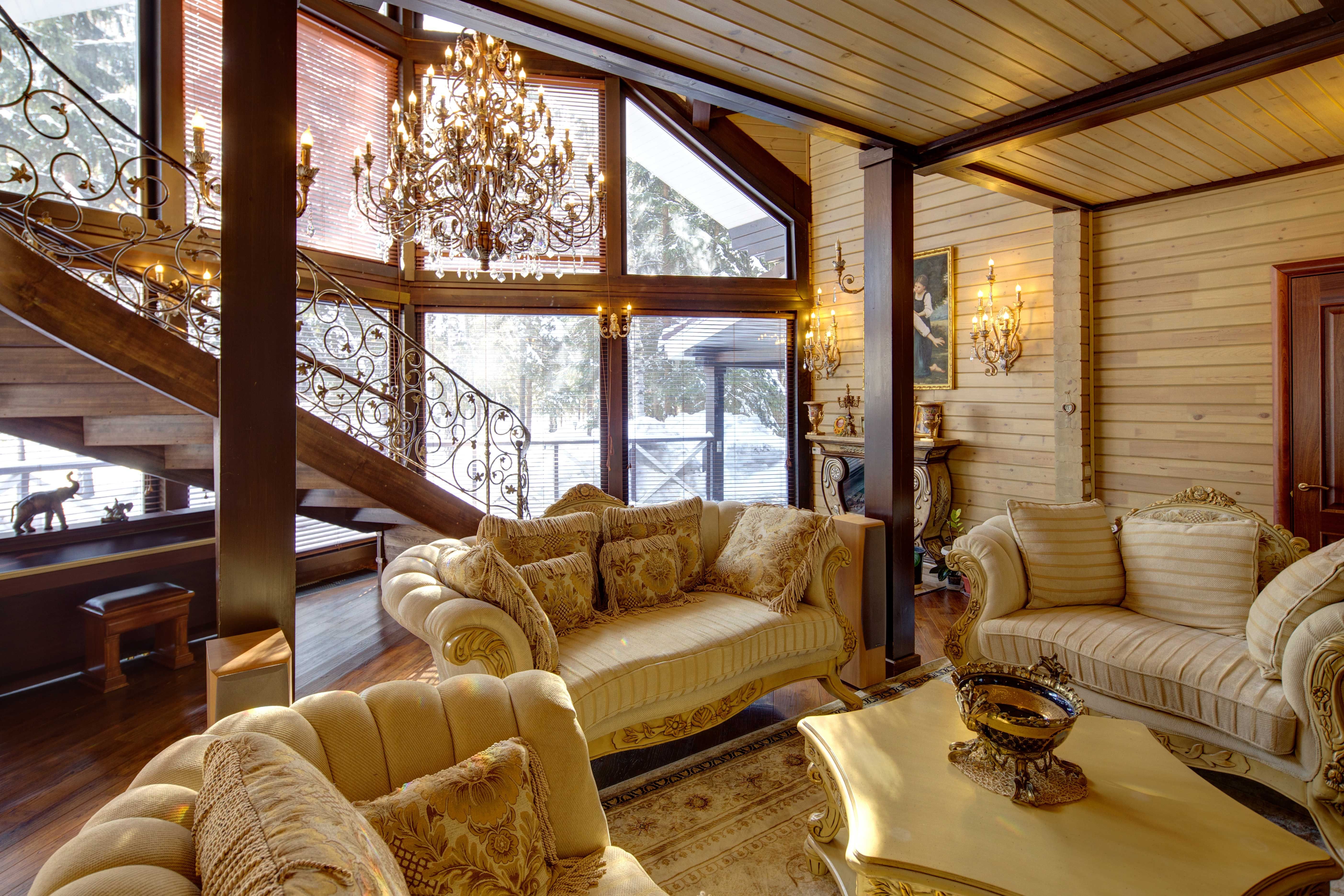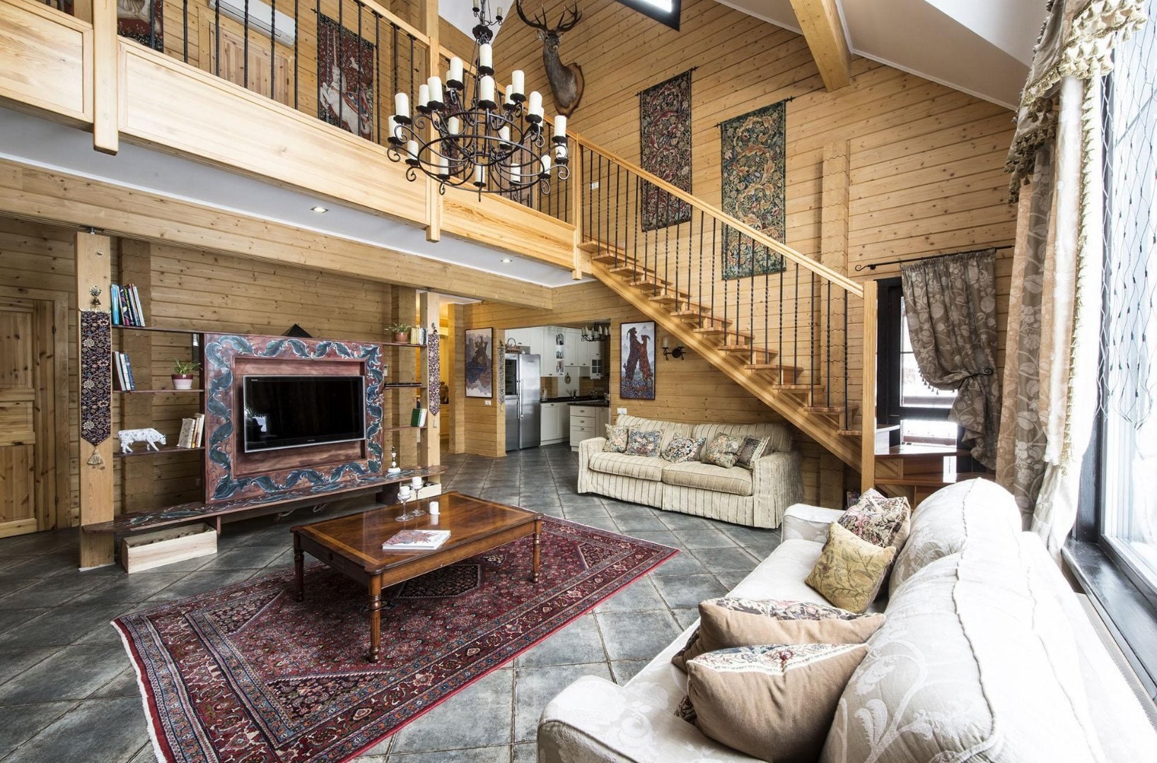 Интерьер гостиной комнаты загородного дома из клееного бруса