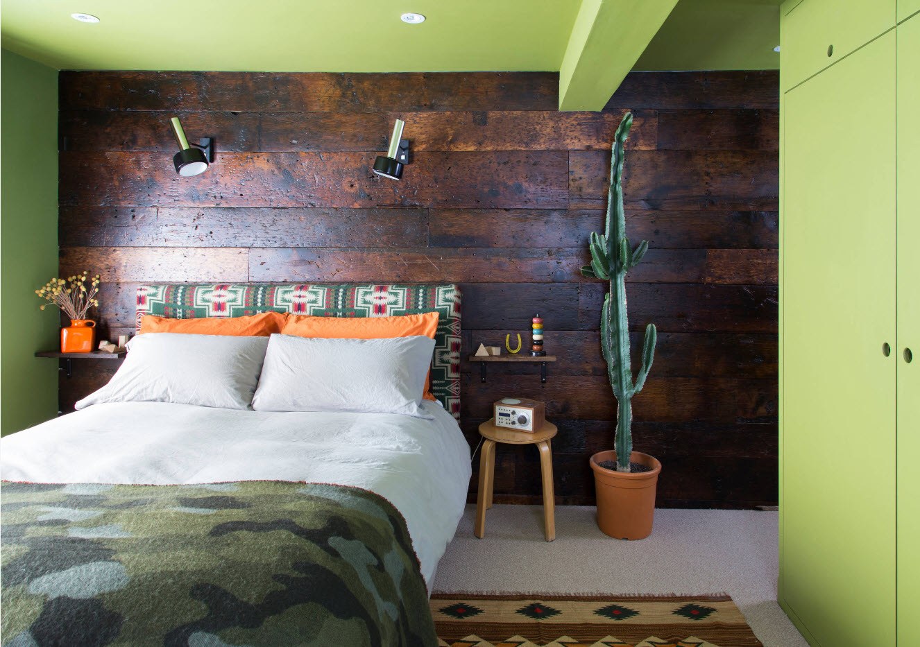 Спальня лофт с зеленой стеной