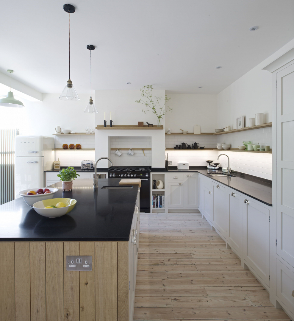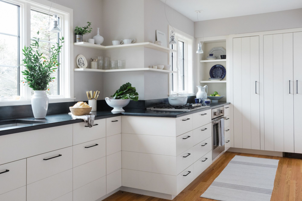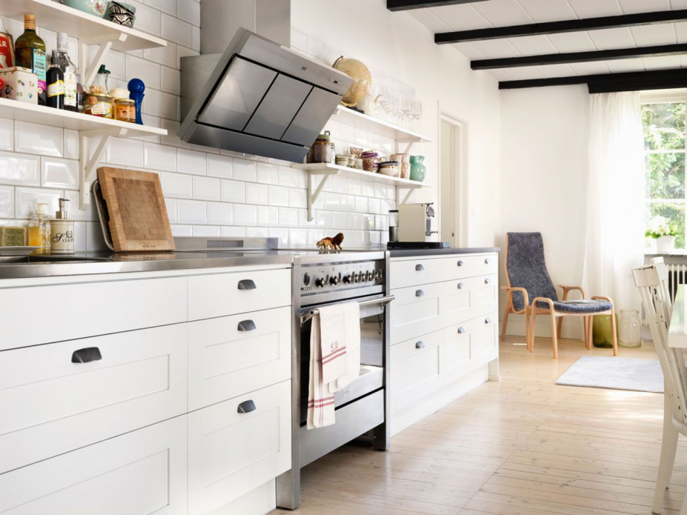 Белая кухня с деревянной столешницей в скандинавском стиле