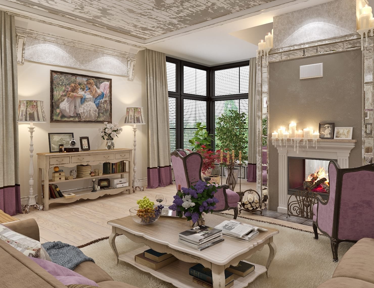 Стиль Прованс в гостиной с камином