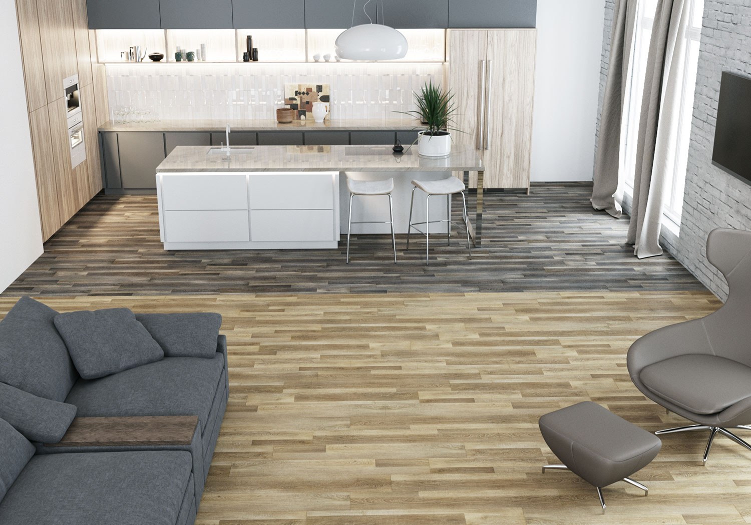 Зонирование кухни плиткой и ламинатом