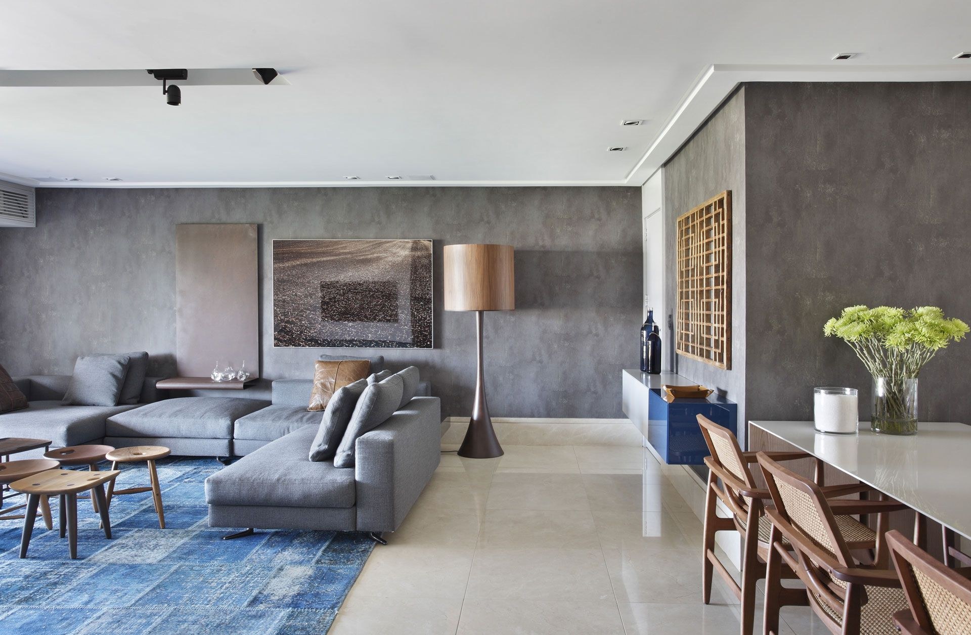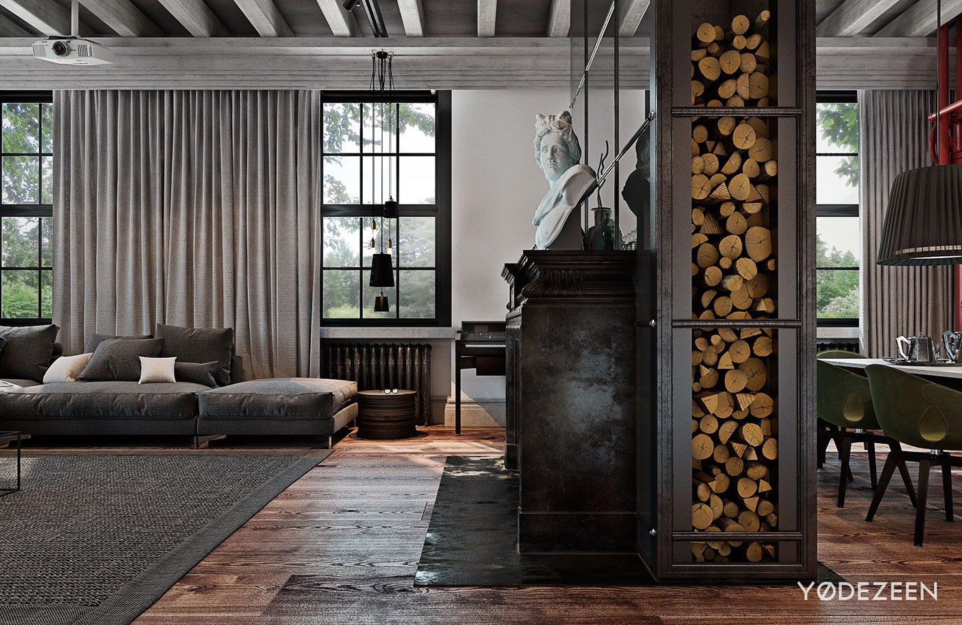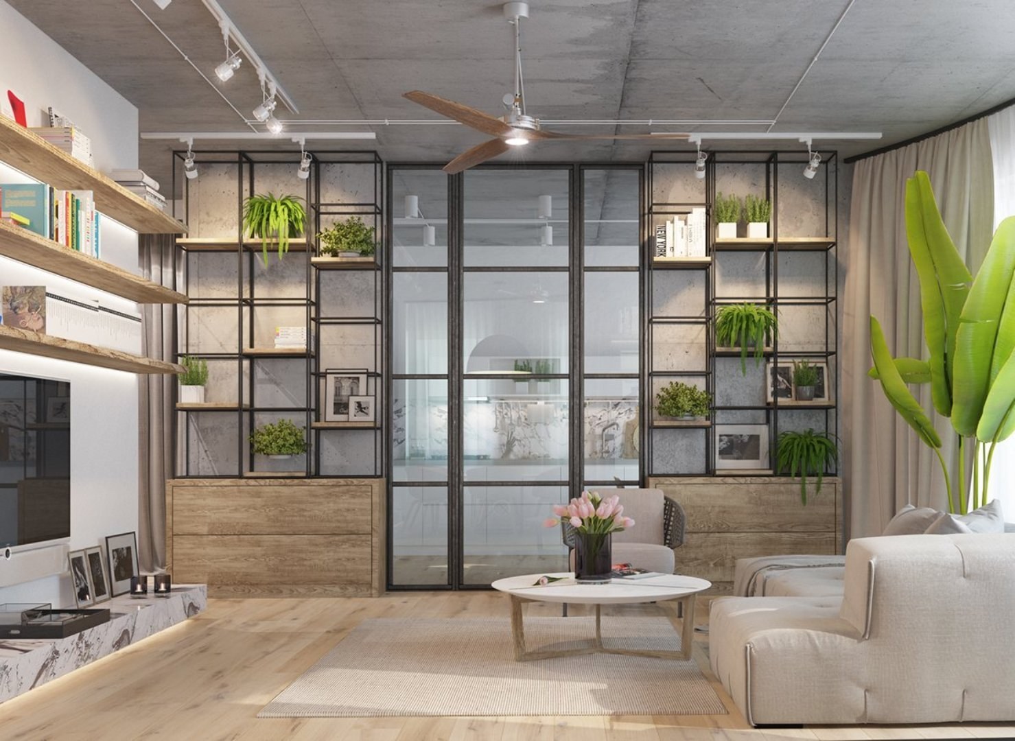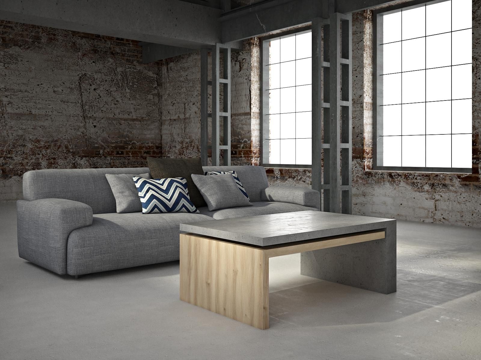 Бетон и дерево в интерьере гостиной