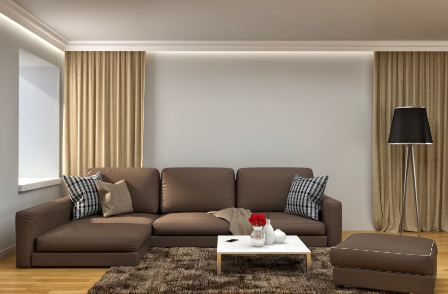 Шторы под коричневый диван в интерьере (51 фото)
