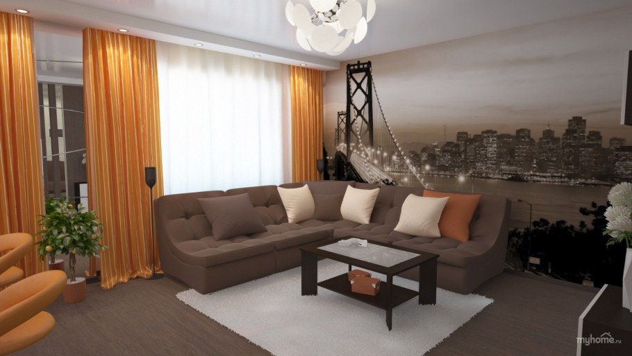 Коричневые шторы в интерьере гостиной