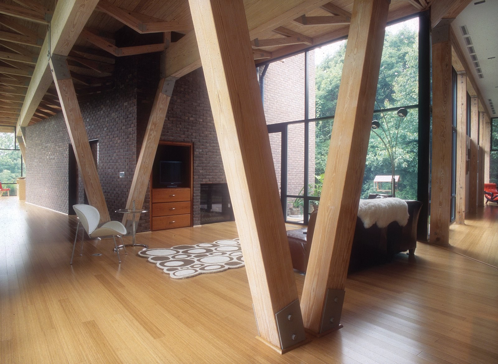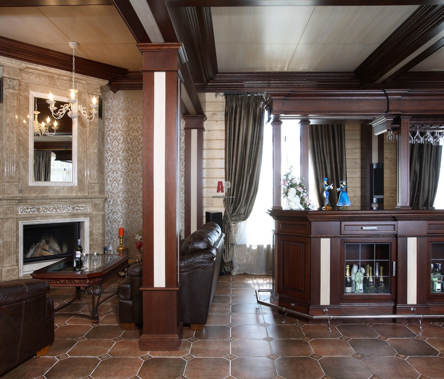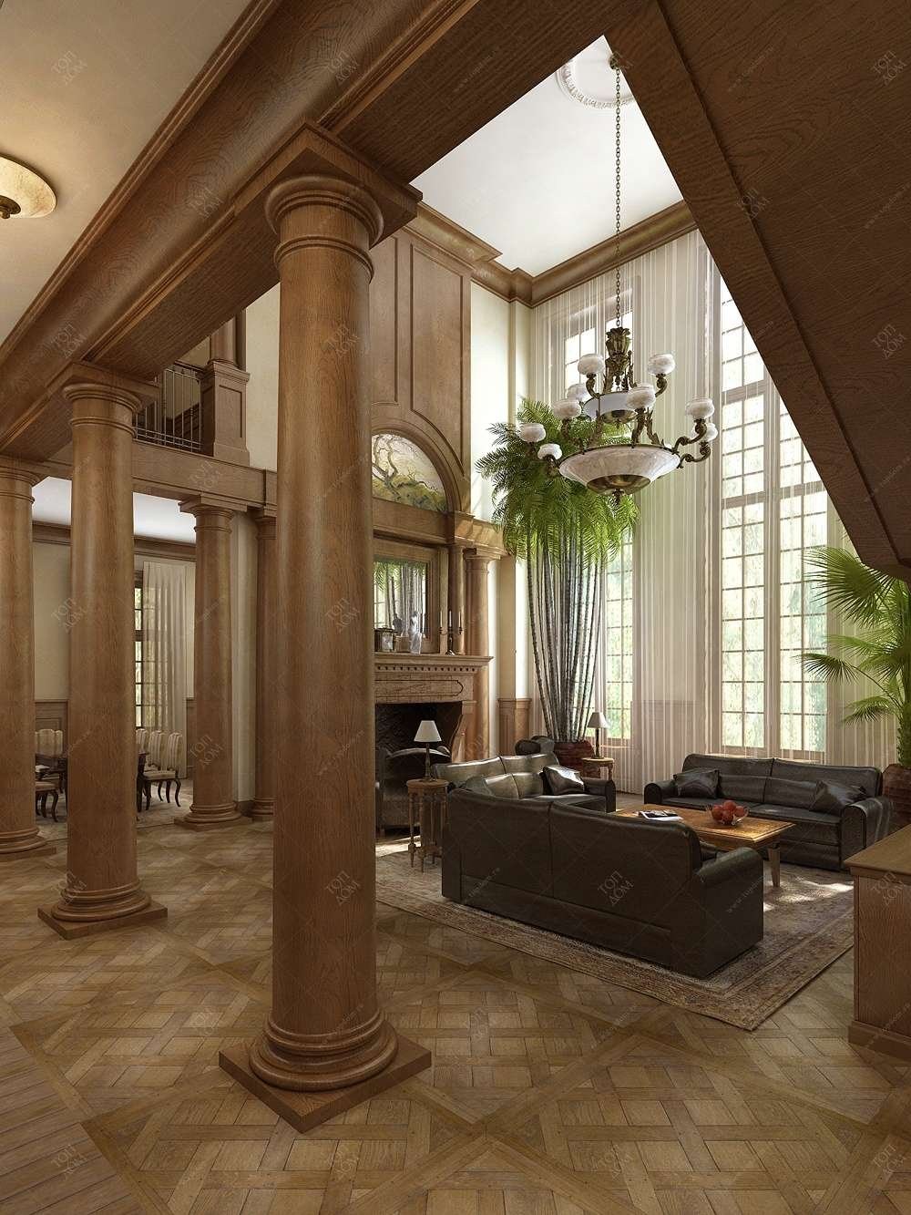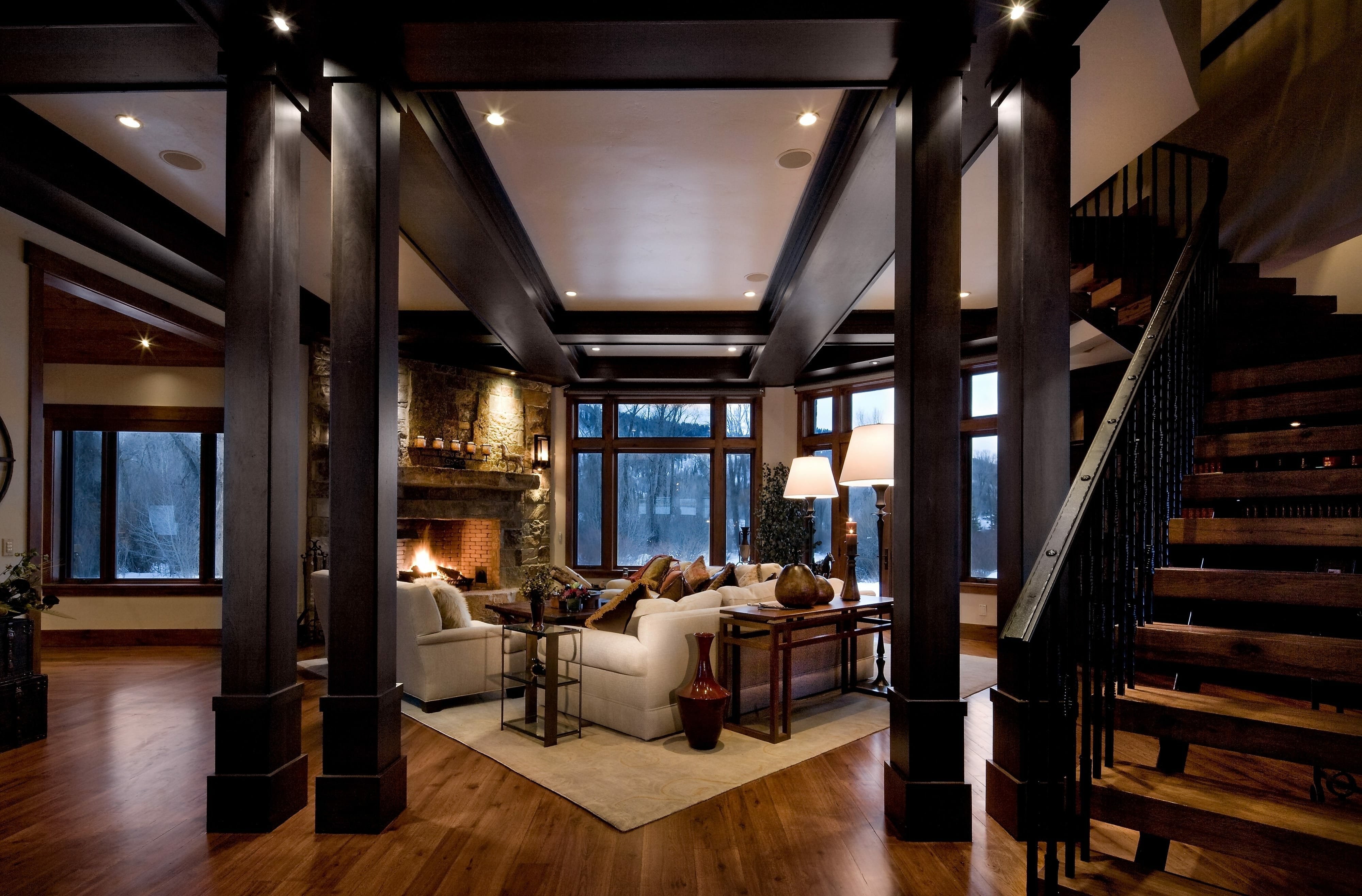 Колонны из дерева в интерьере гостиной