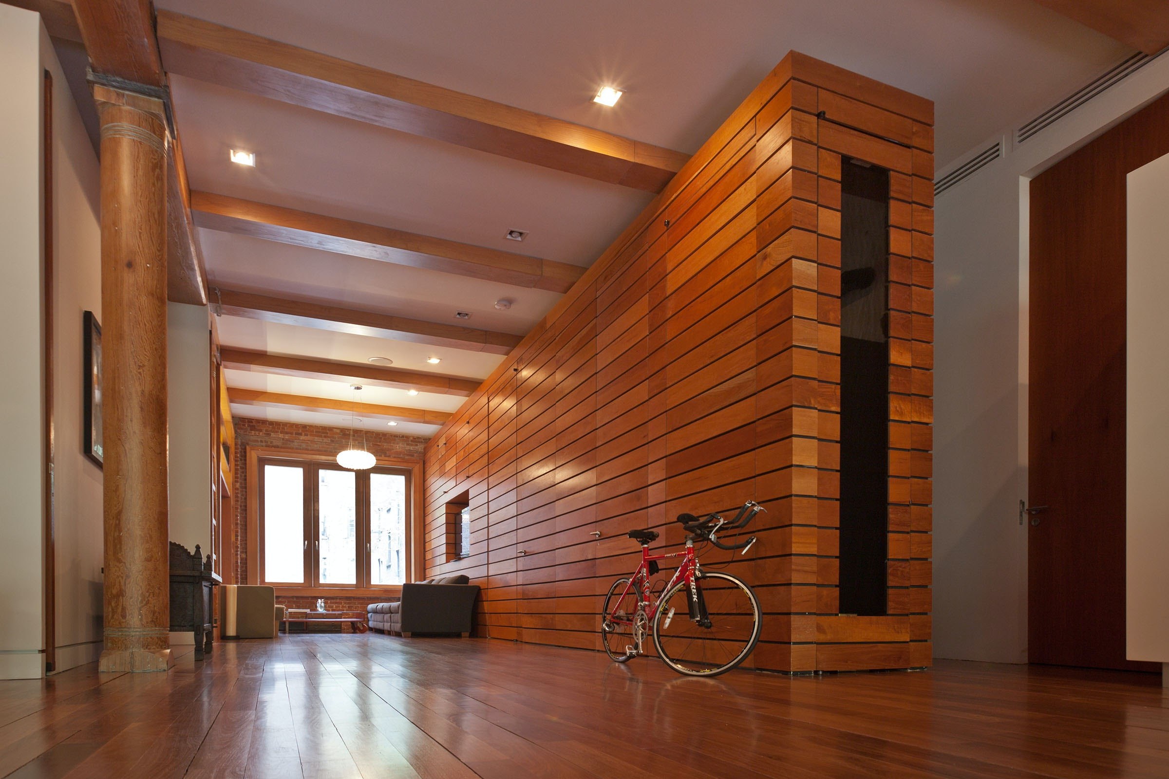 Деревянная колонна в интерьере гостиной