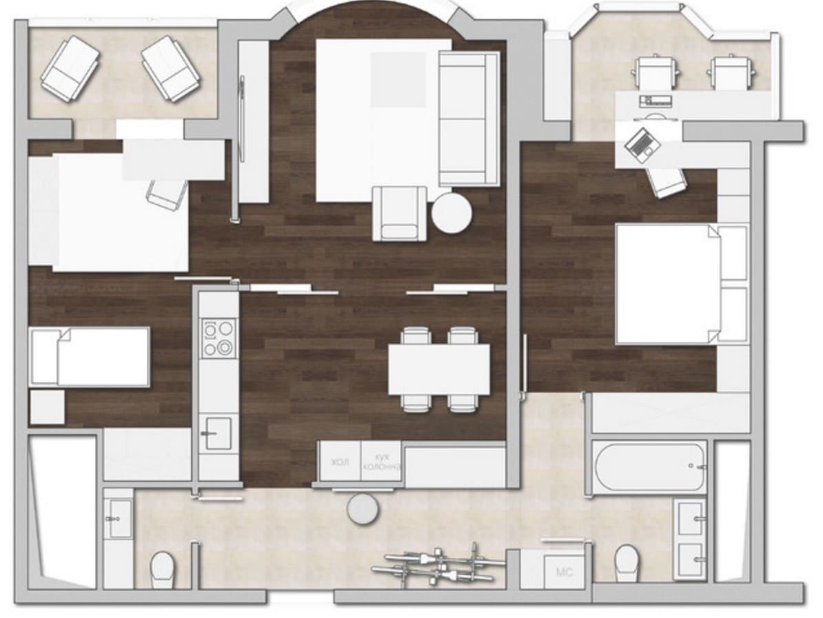Перепланировка двухкомнатной квартиры в хрущевке 45 кв.м