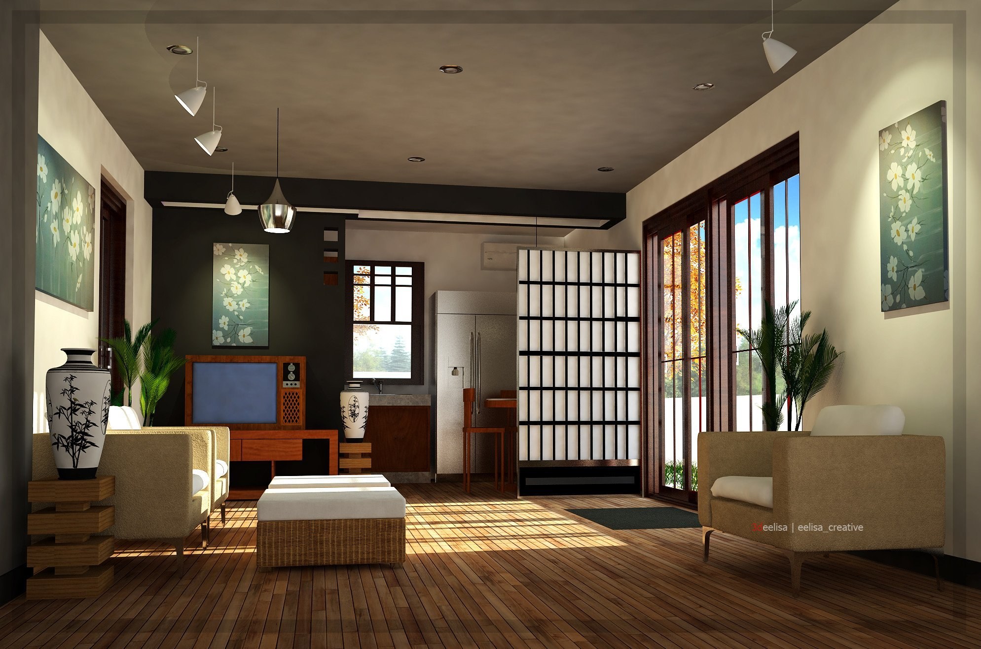 Декор интерьера гостинной комнаты в японском стиле