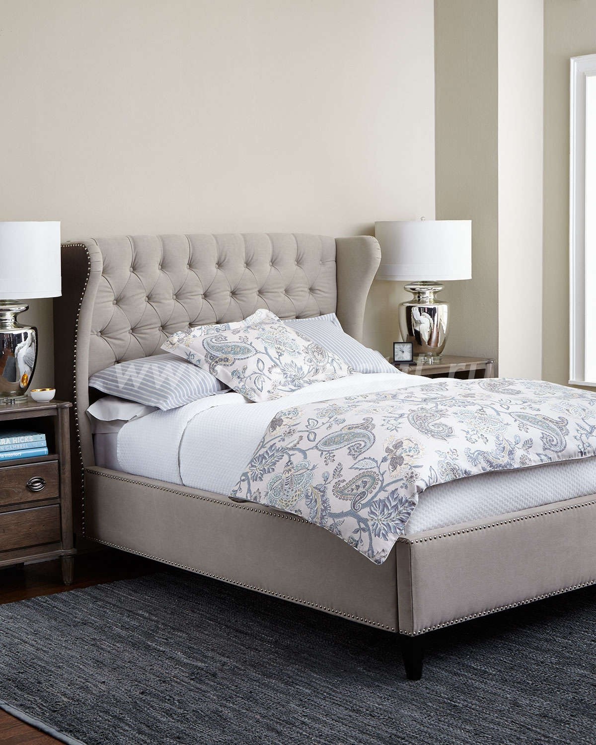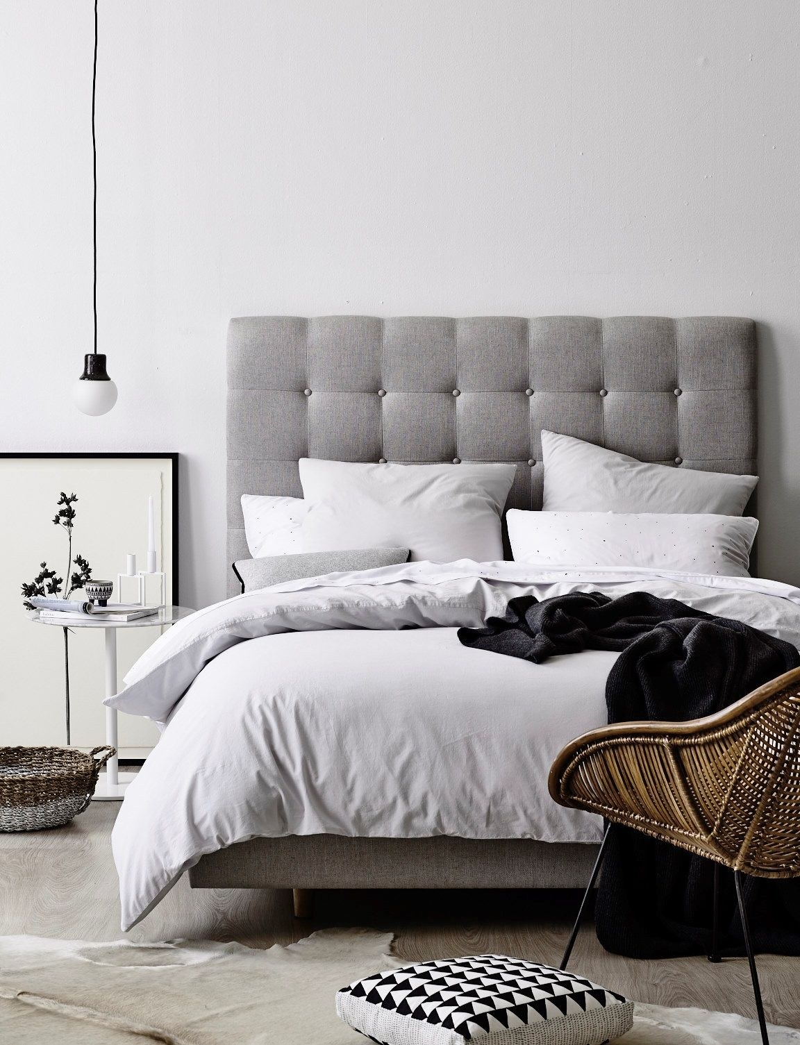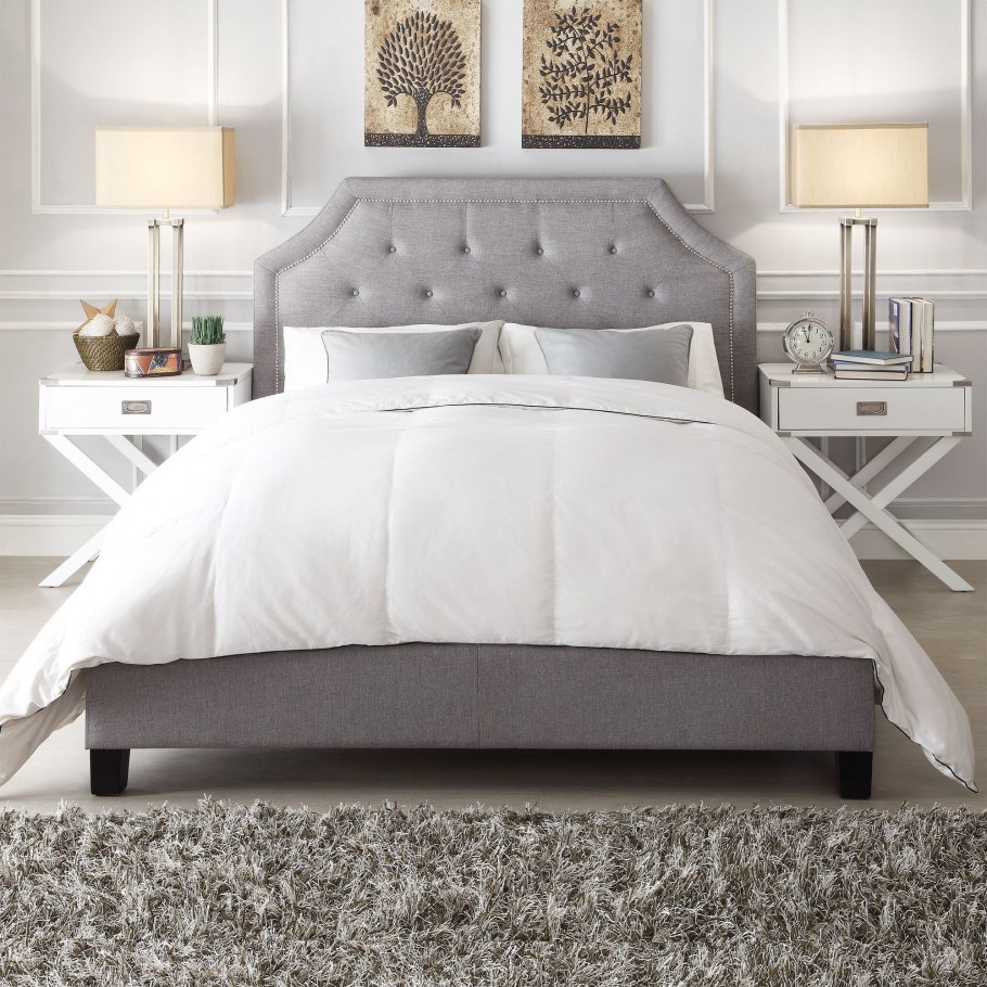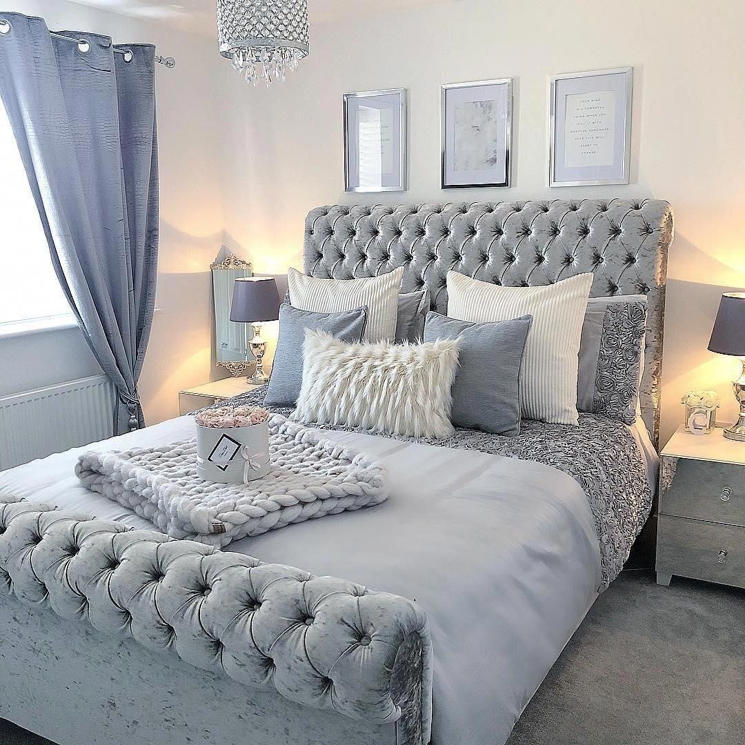 Серая кровать с мягким изголовьем в интерьере спальни (71 фото)