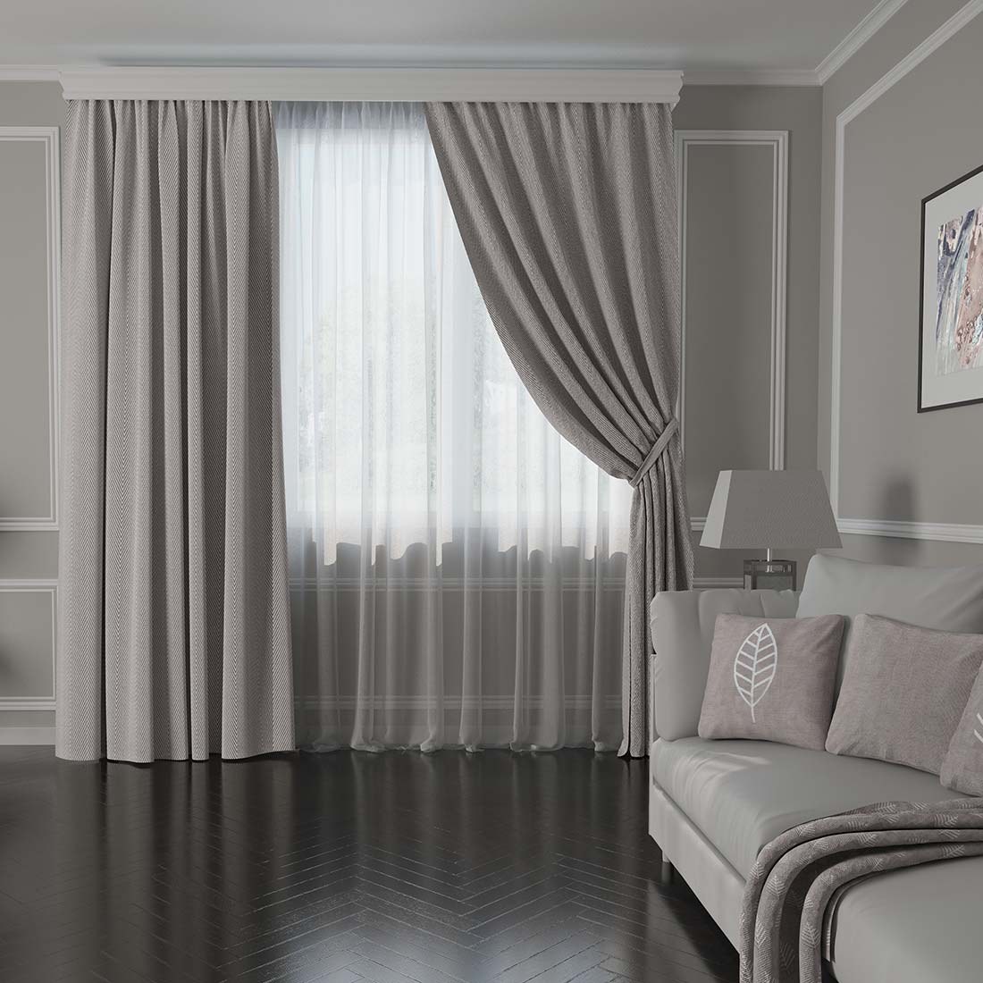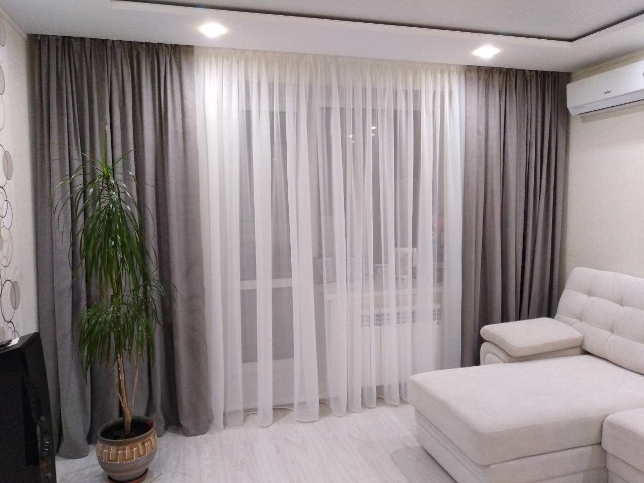 Шторы и тюль в бело-сером цвете