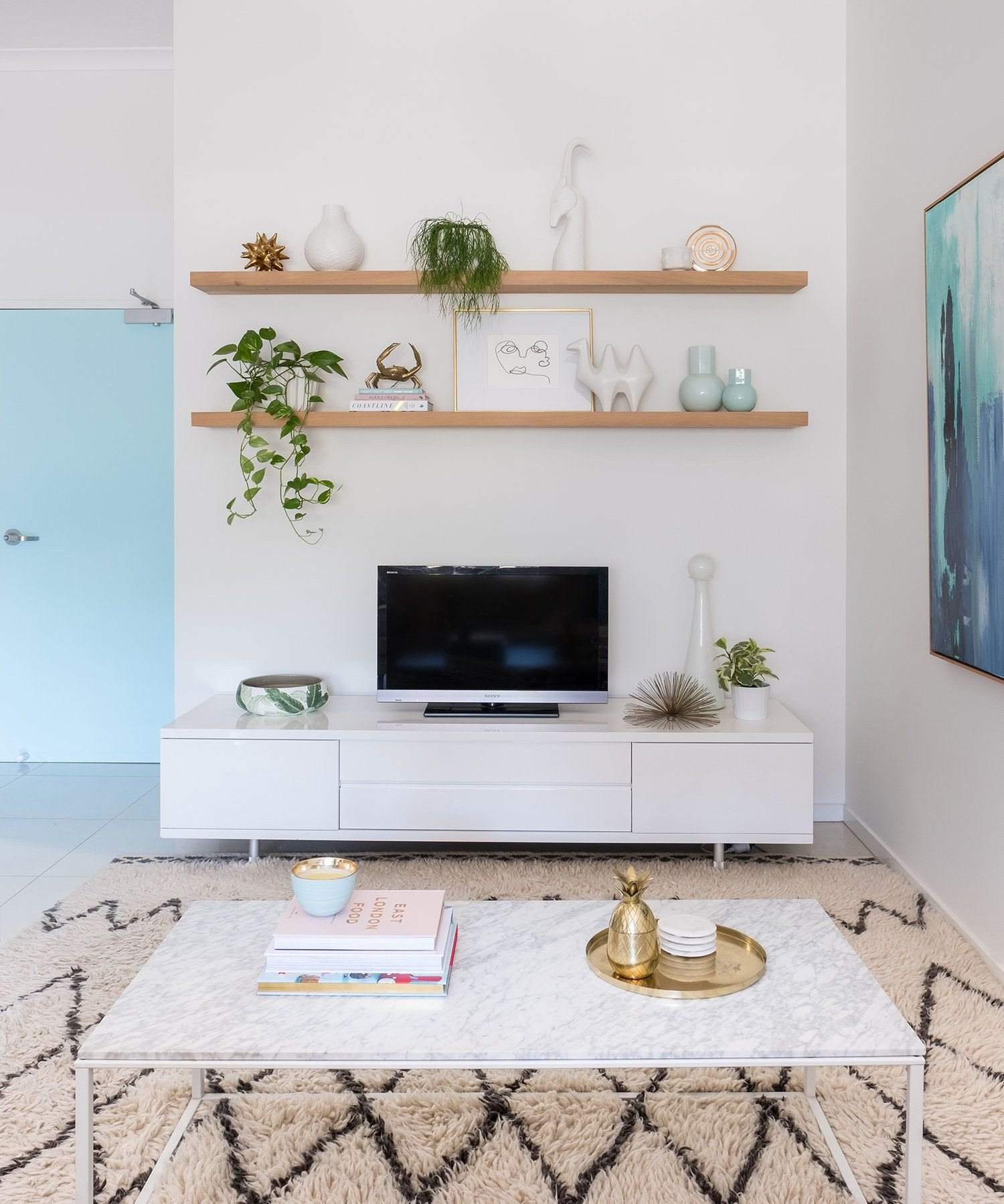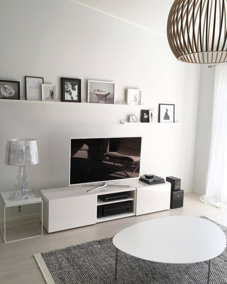 Полочки над телевизором в гостиной