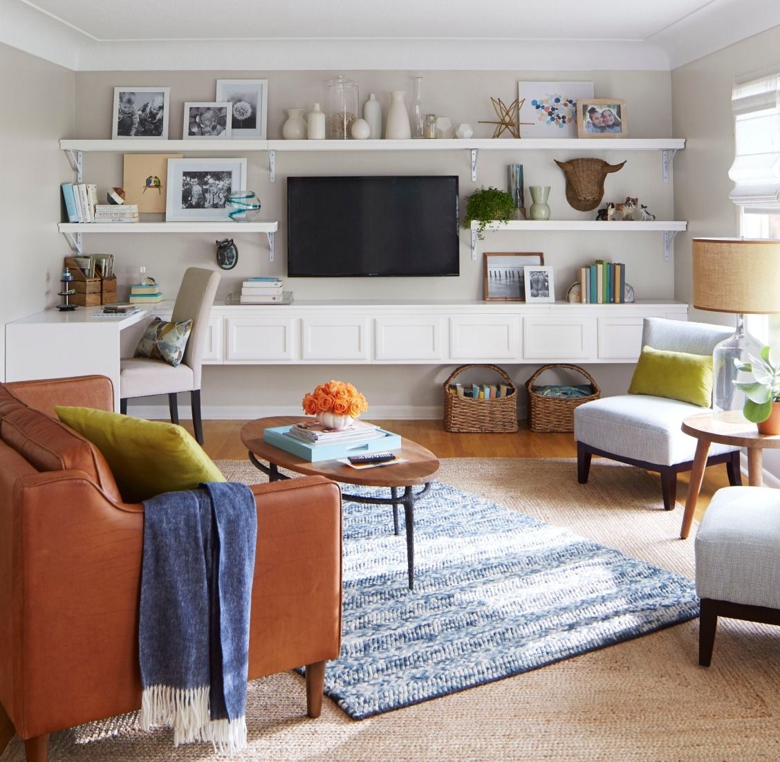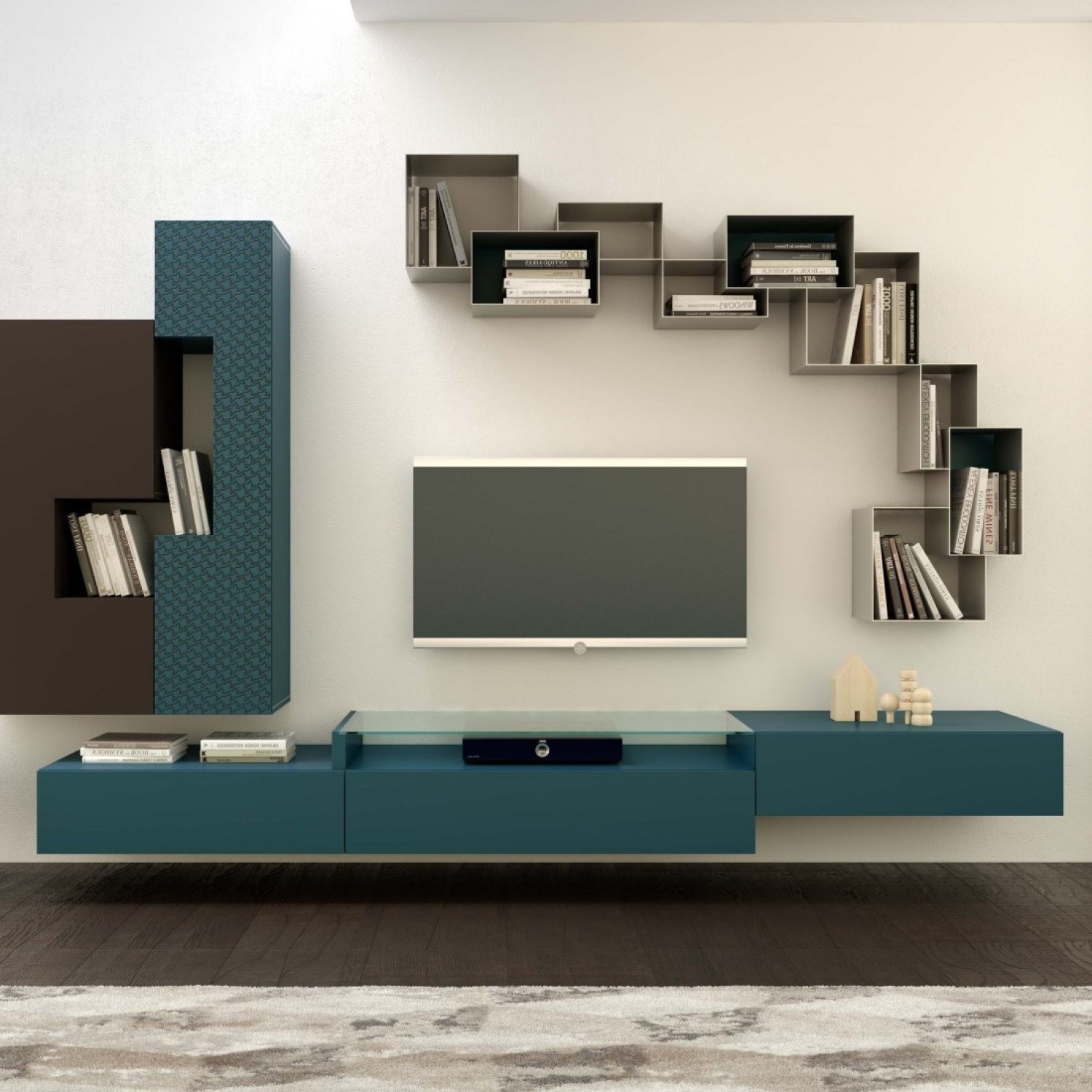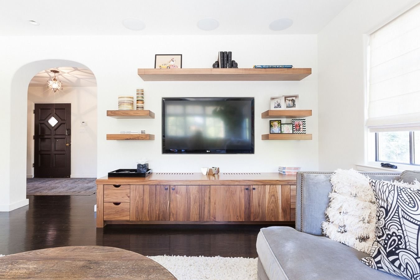 Полки над телевизором в гостиной