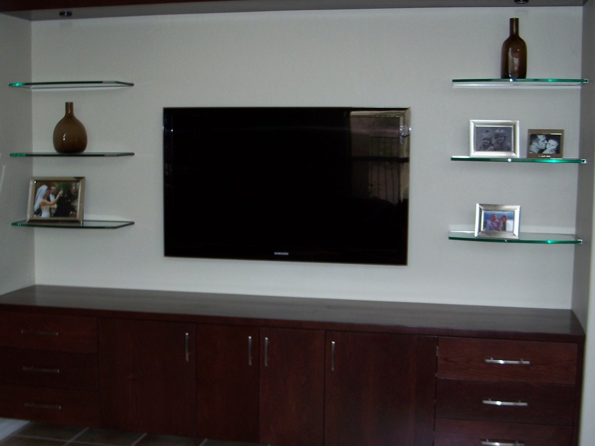 Стеклянные полки вокруг телевизора