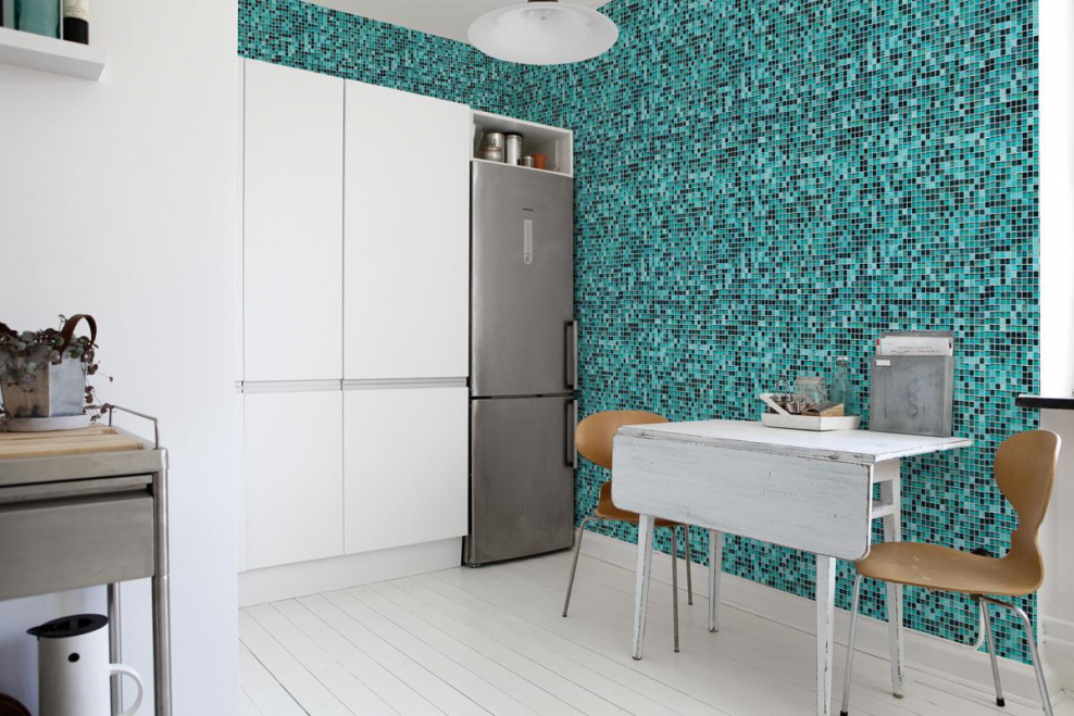 Бирюзовые обои в интерьере кухни
