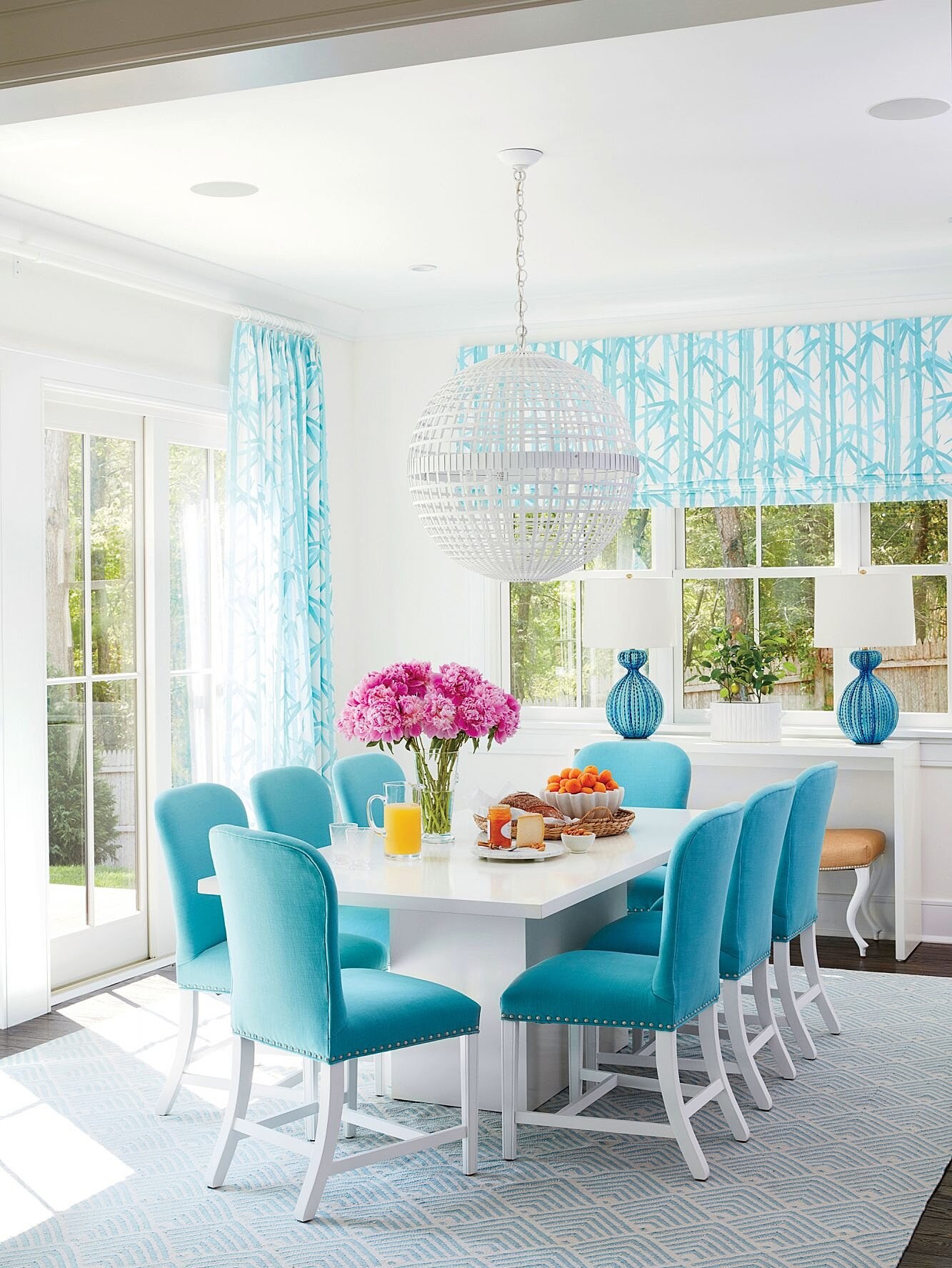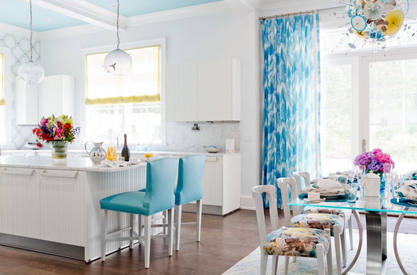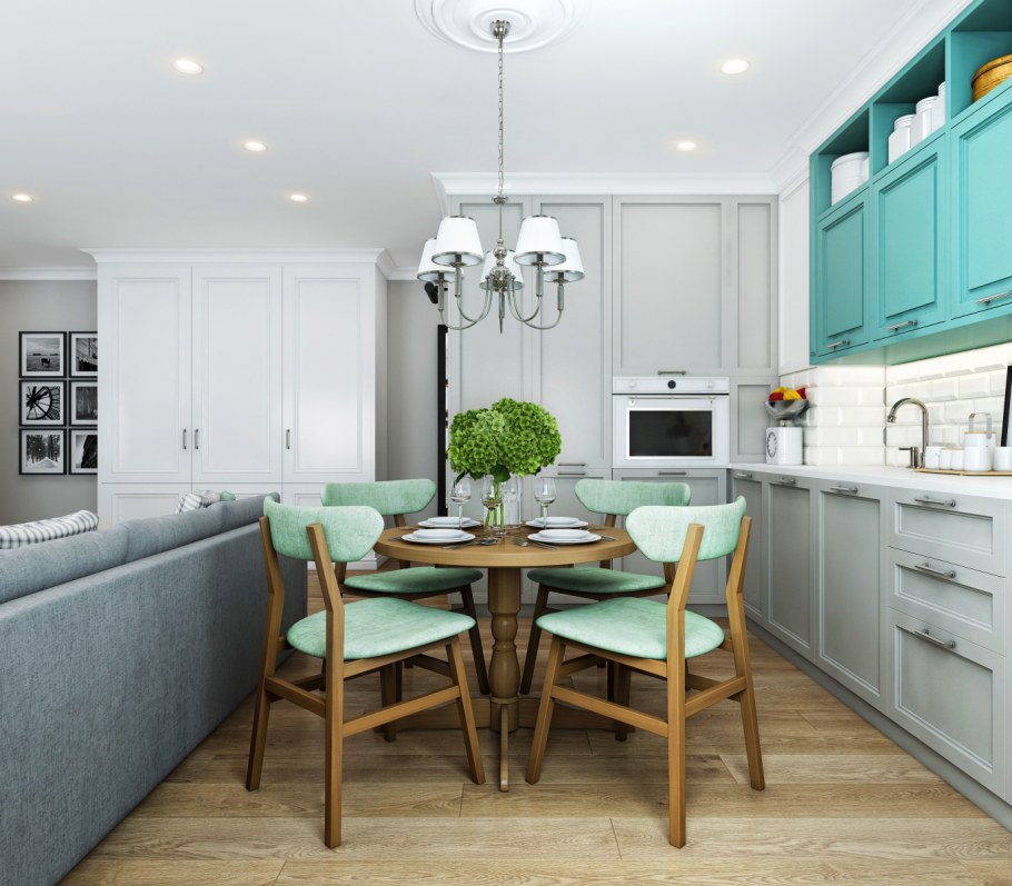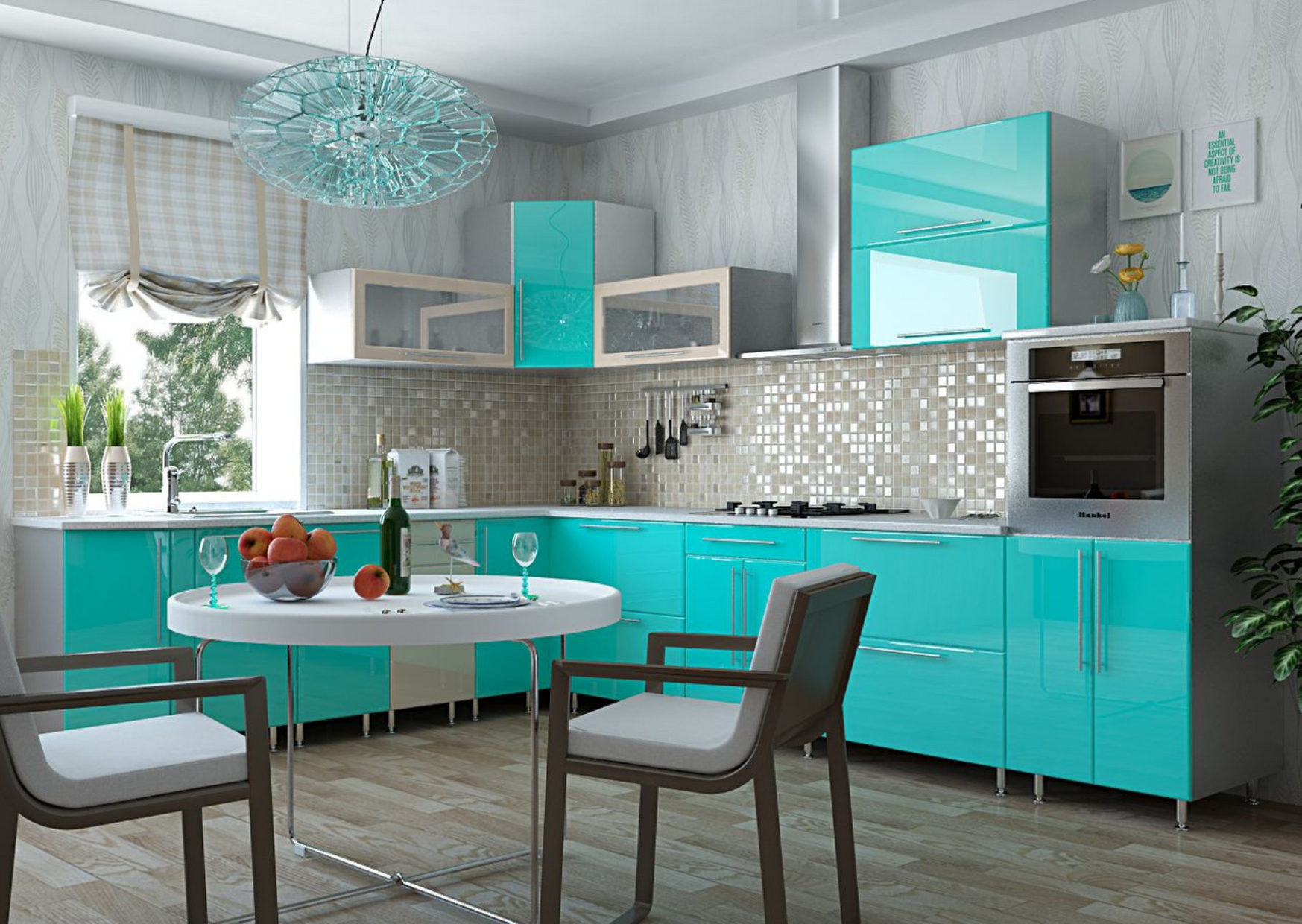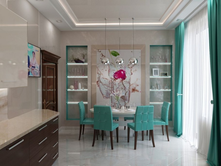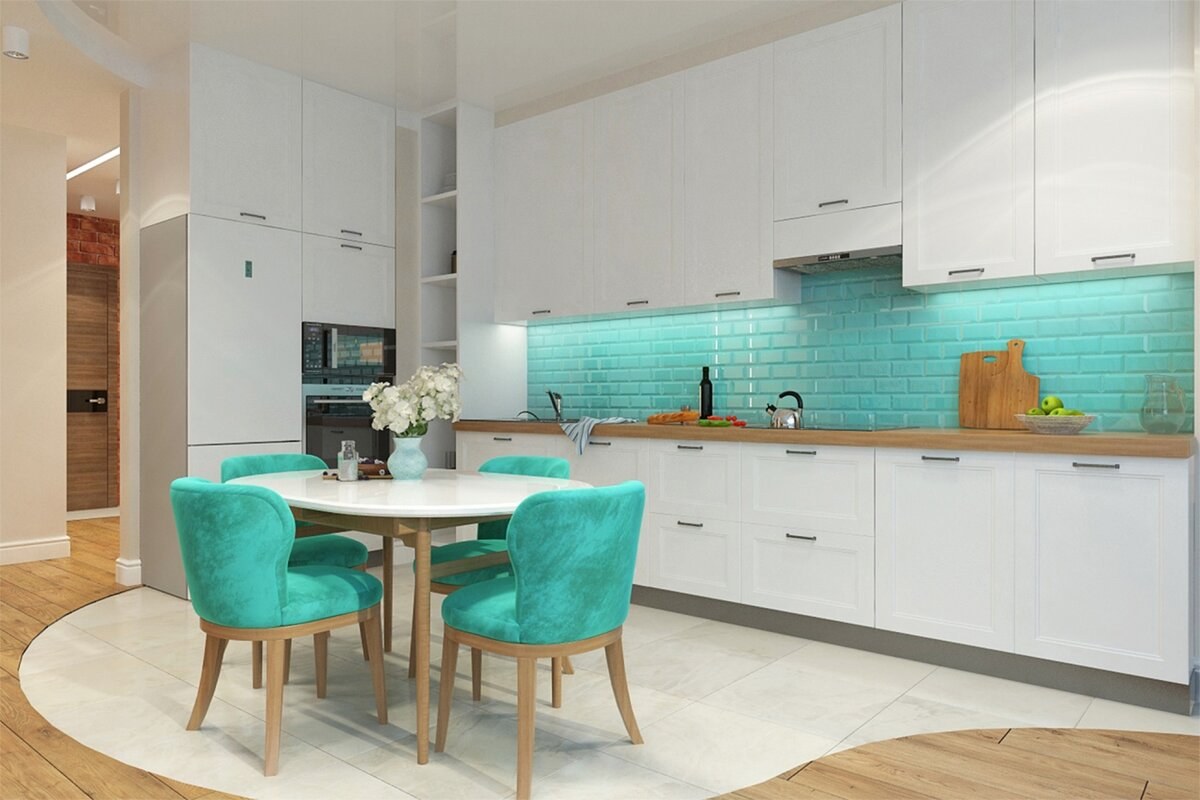 Ярко бирюзовый цвет в кухне с обеденным столом