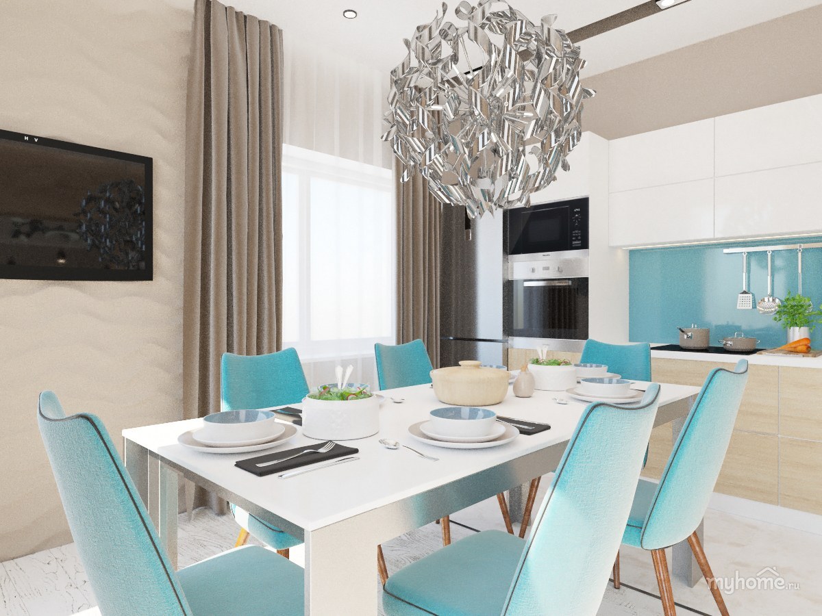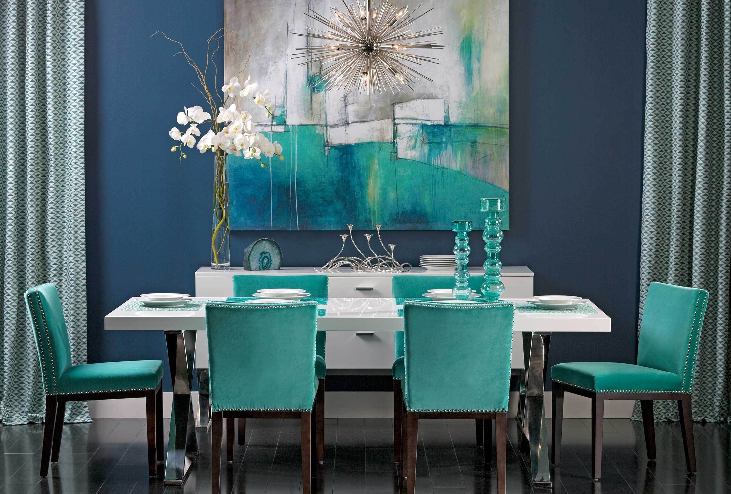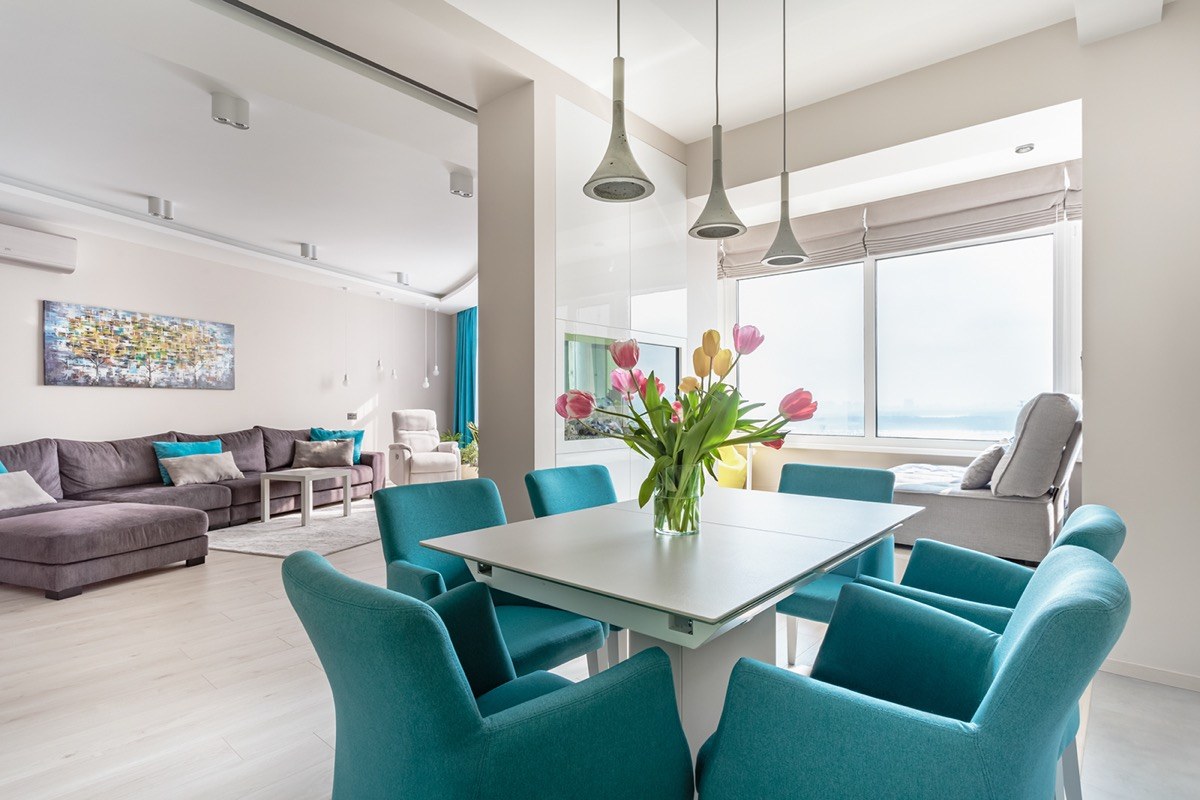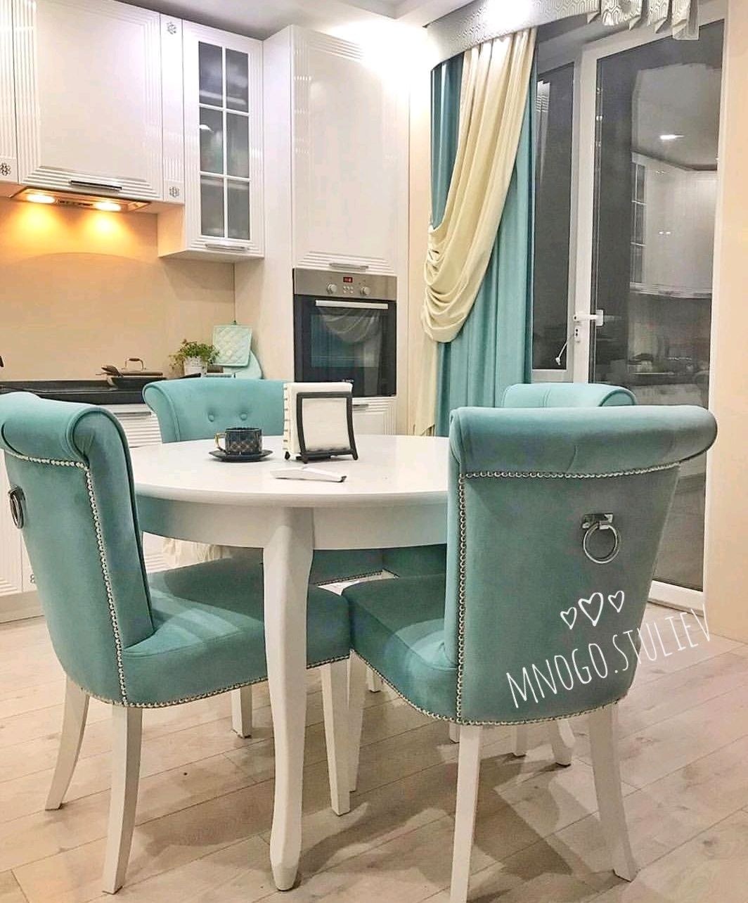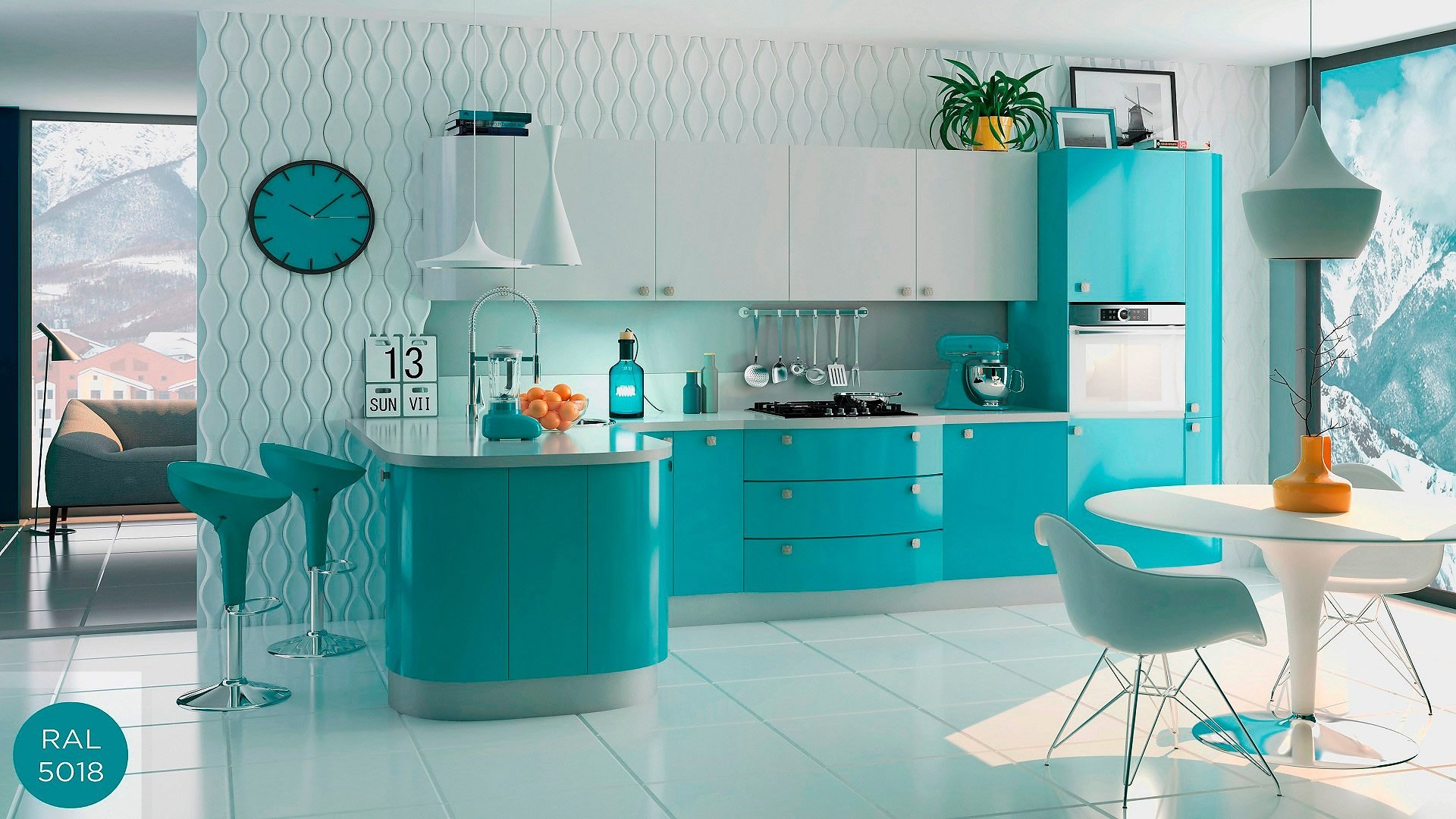 Ярко бирюзовый цвет в кухне с обеденным столом