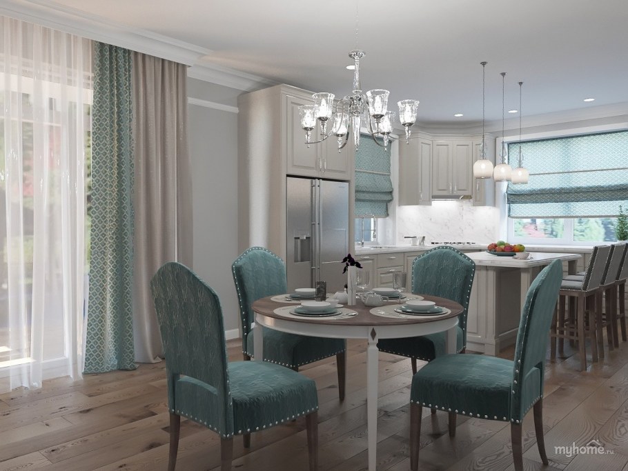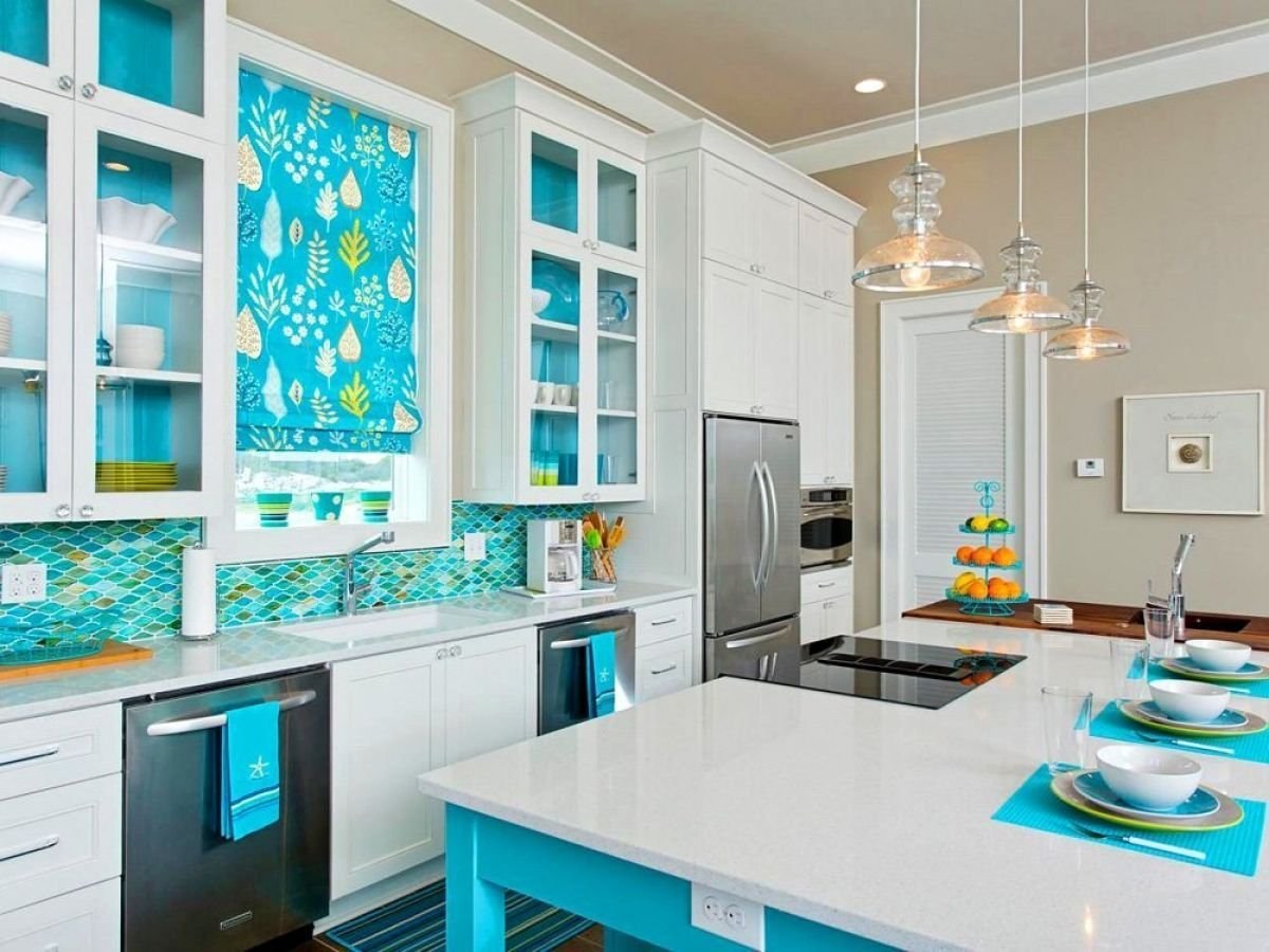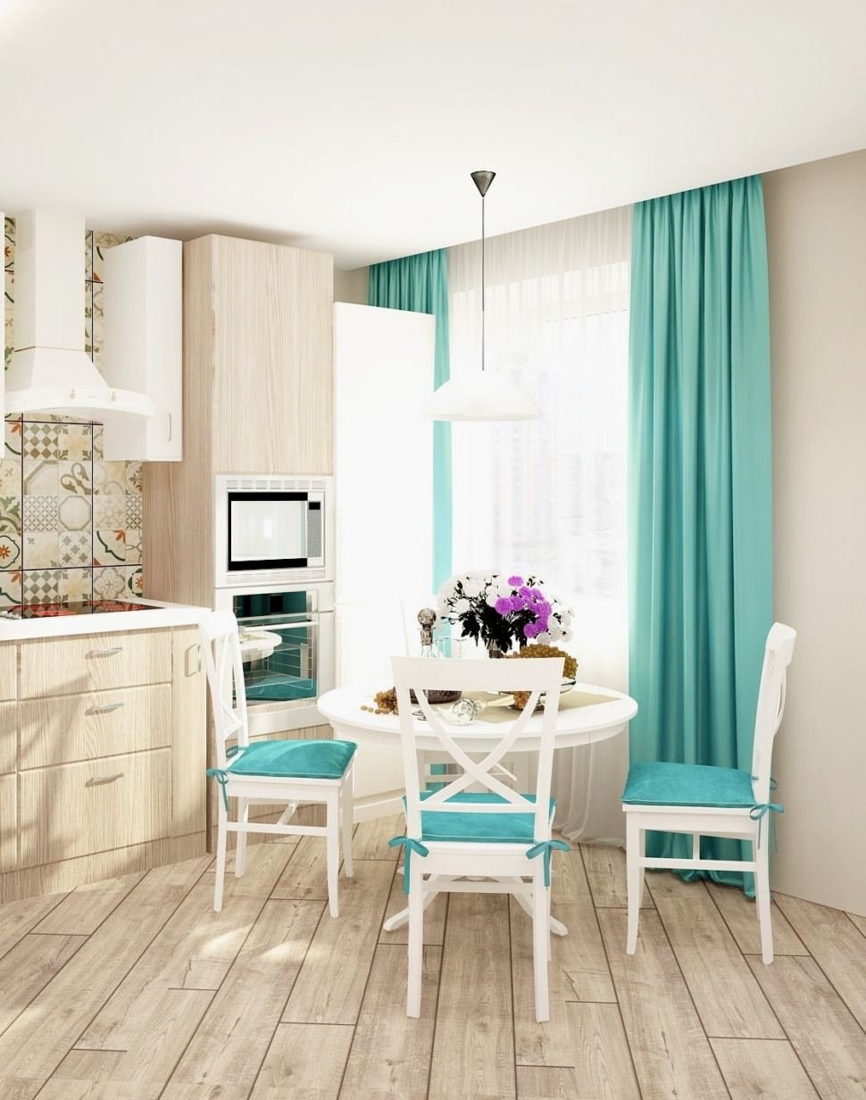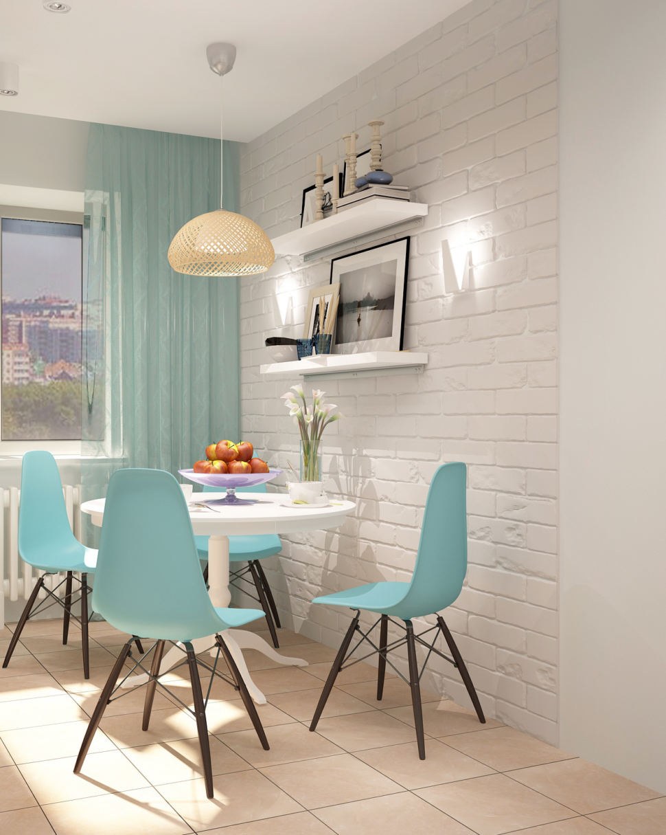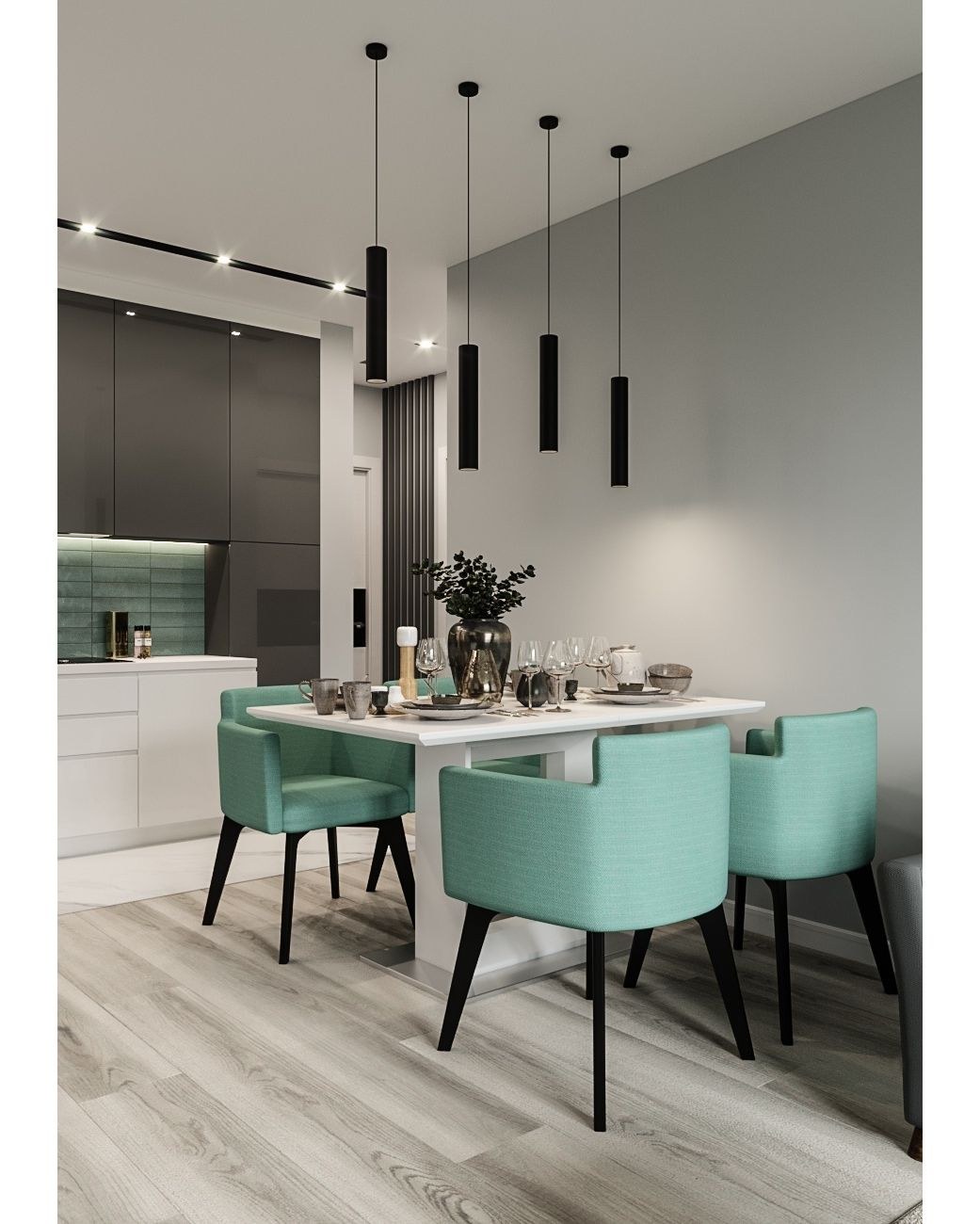Ярко бирюзовый цвет в кухне с обеденным столом