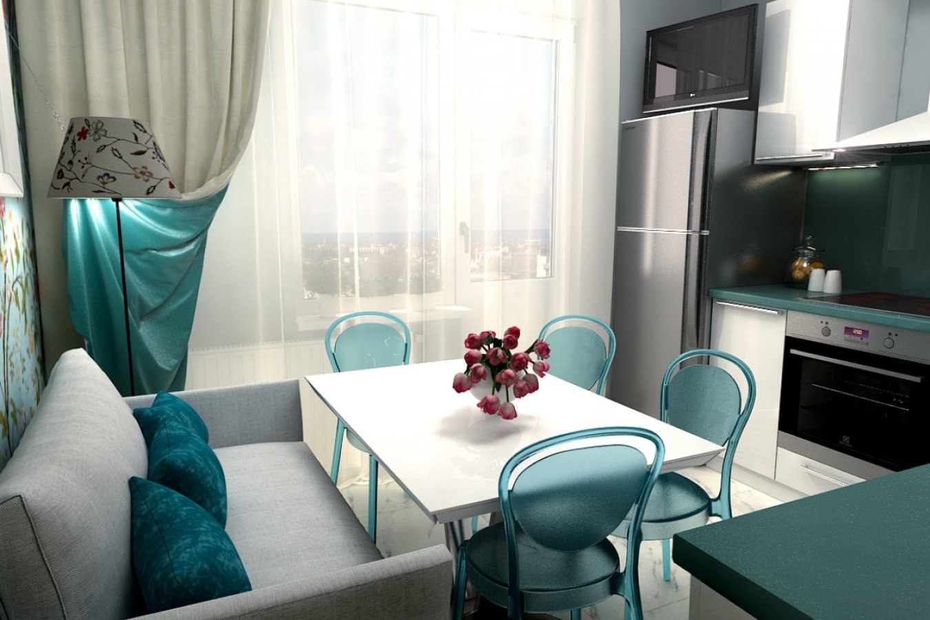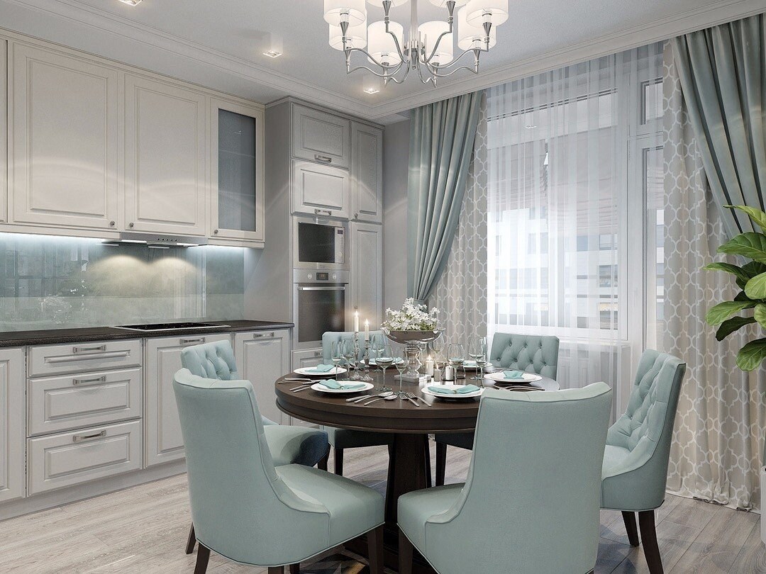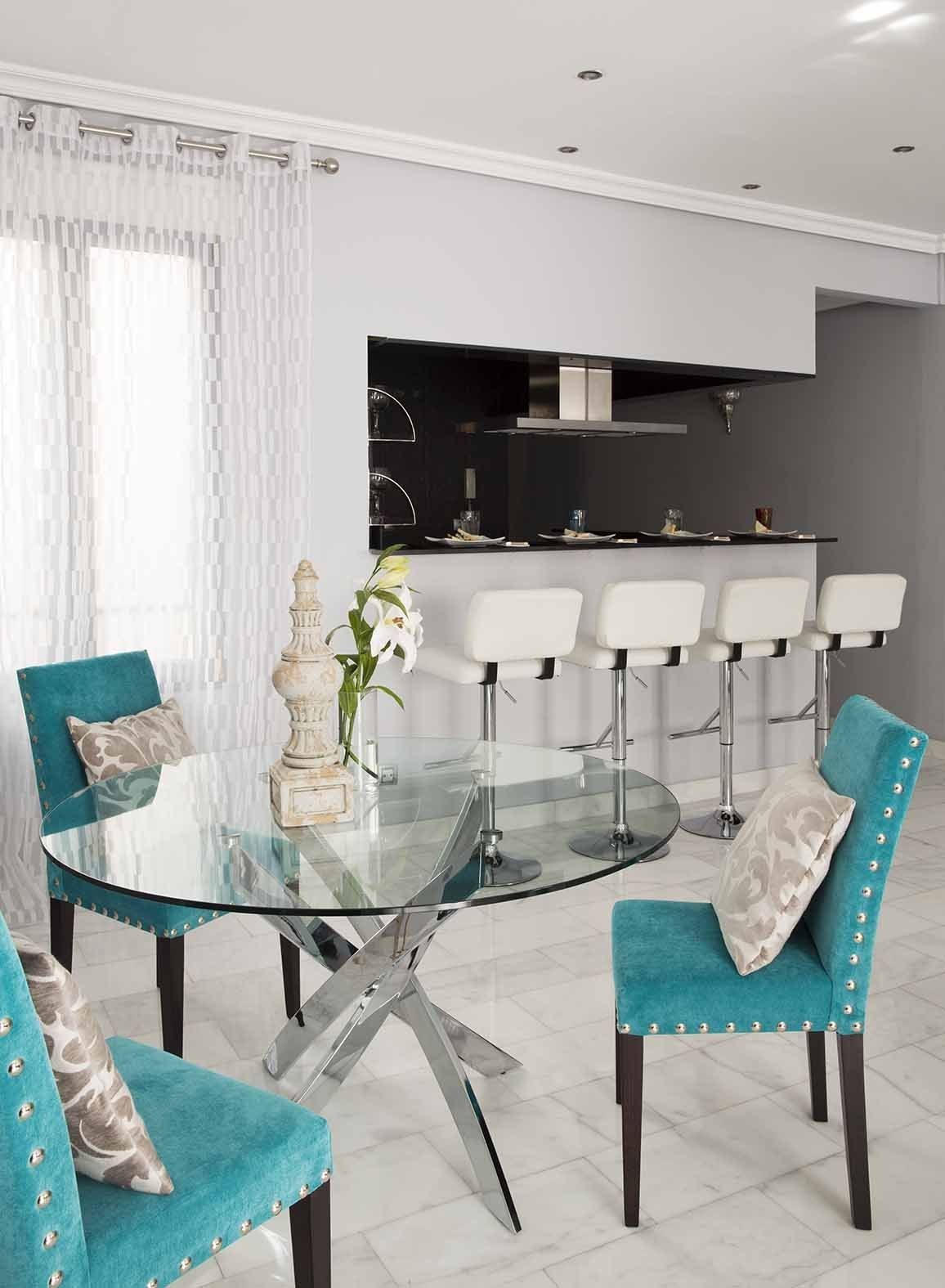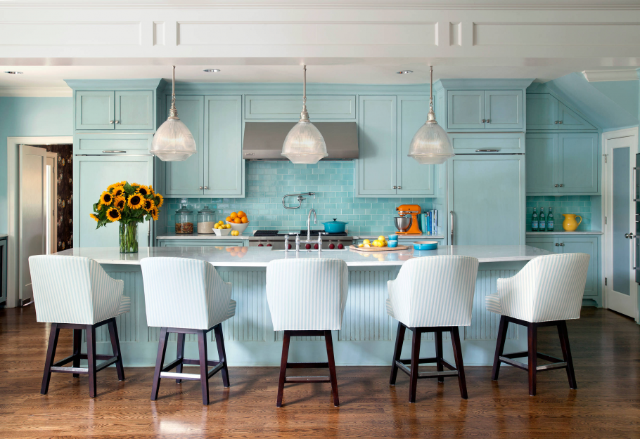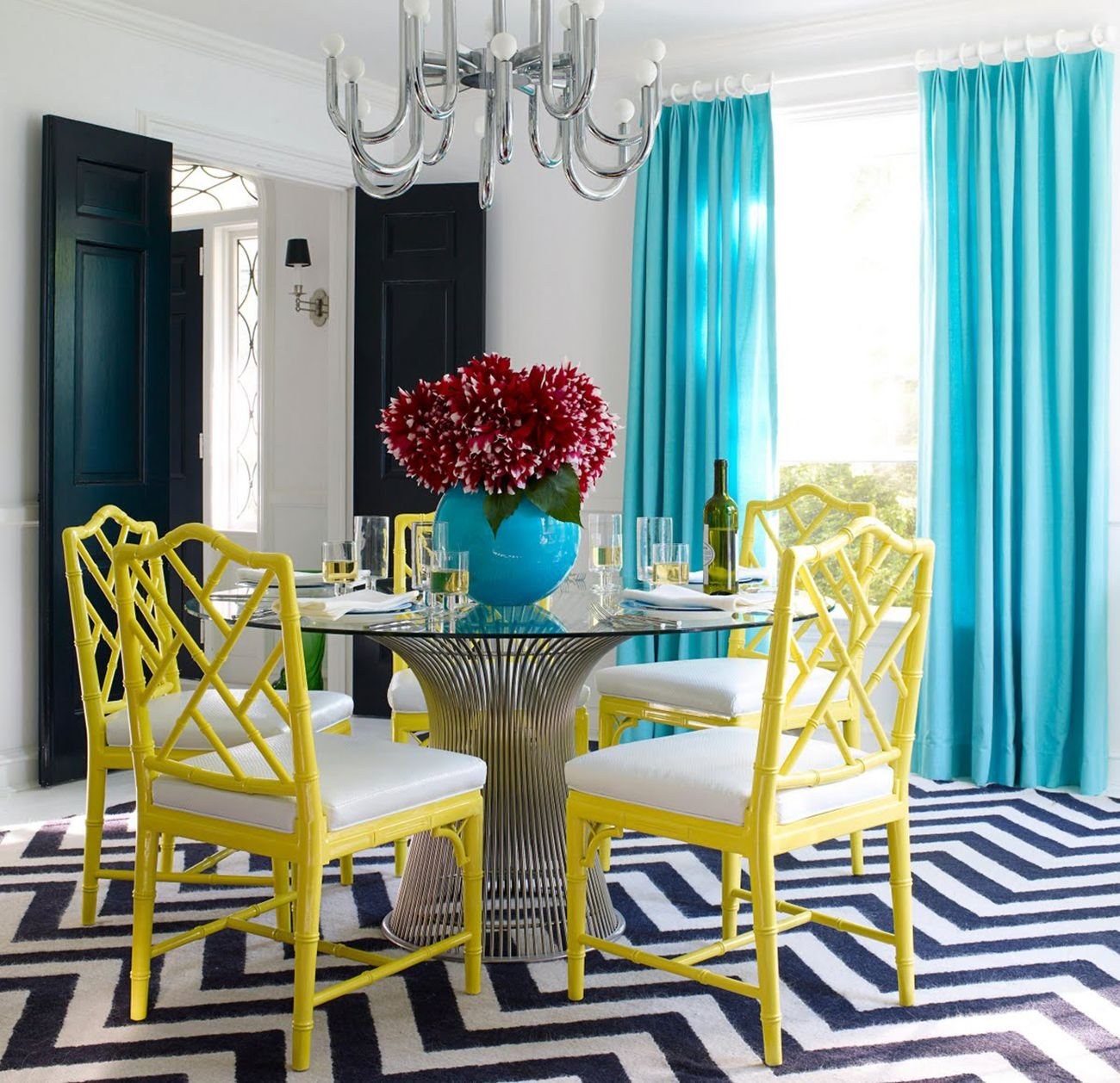 Ярко бирюзовый цвет в кухне с обеденным столом