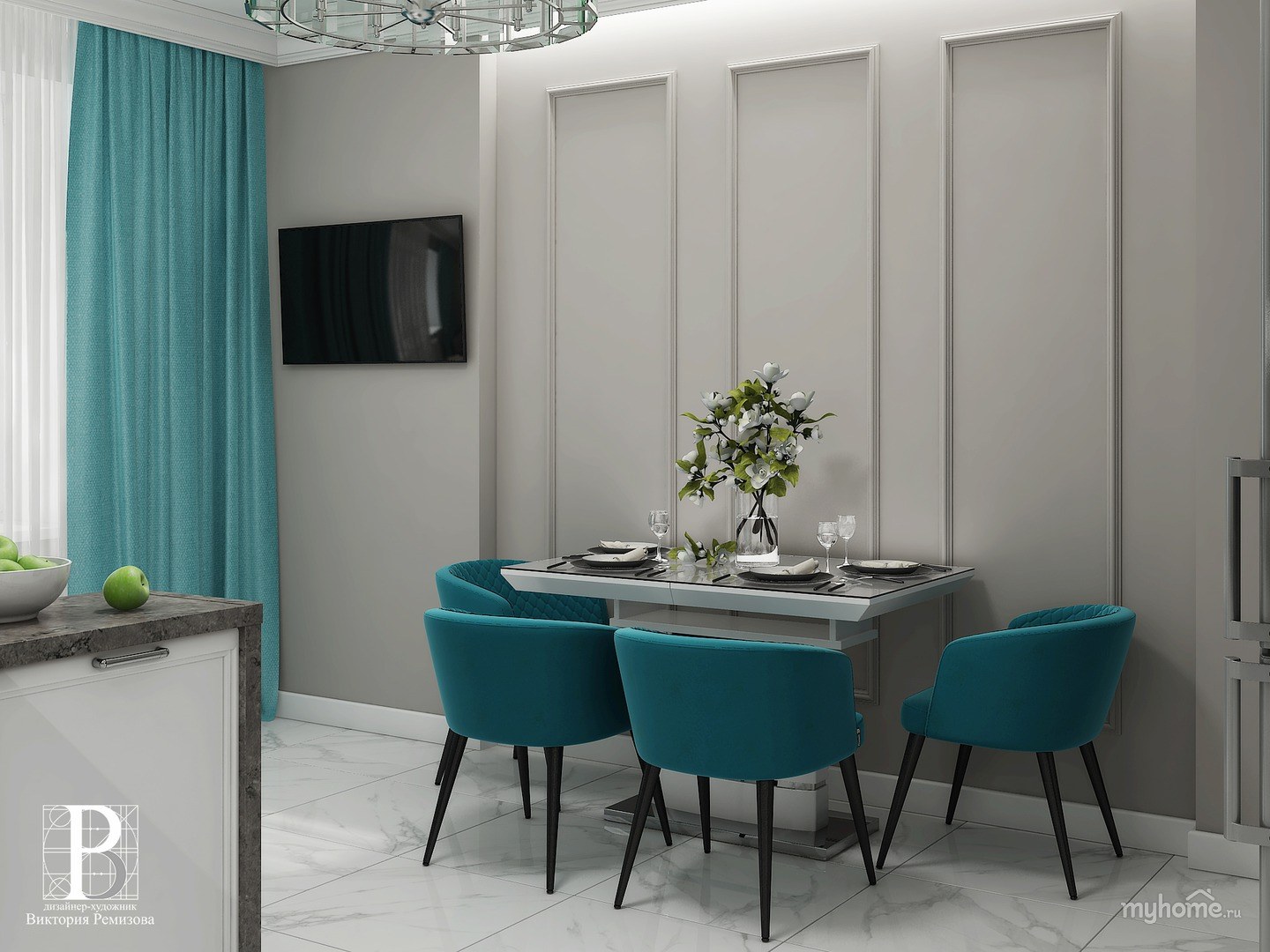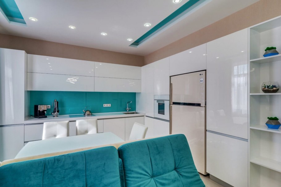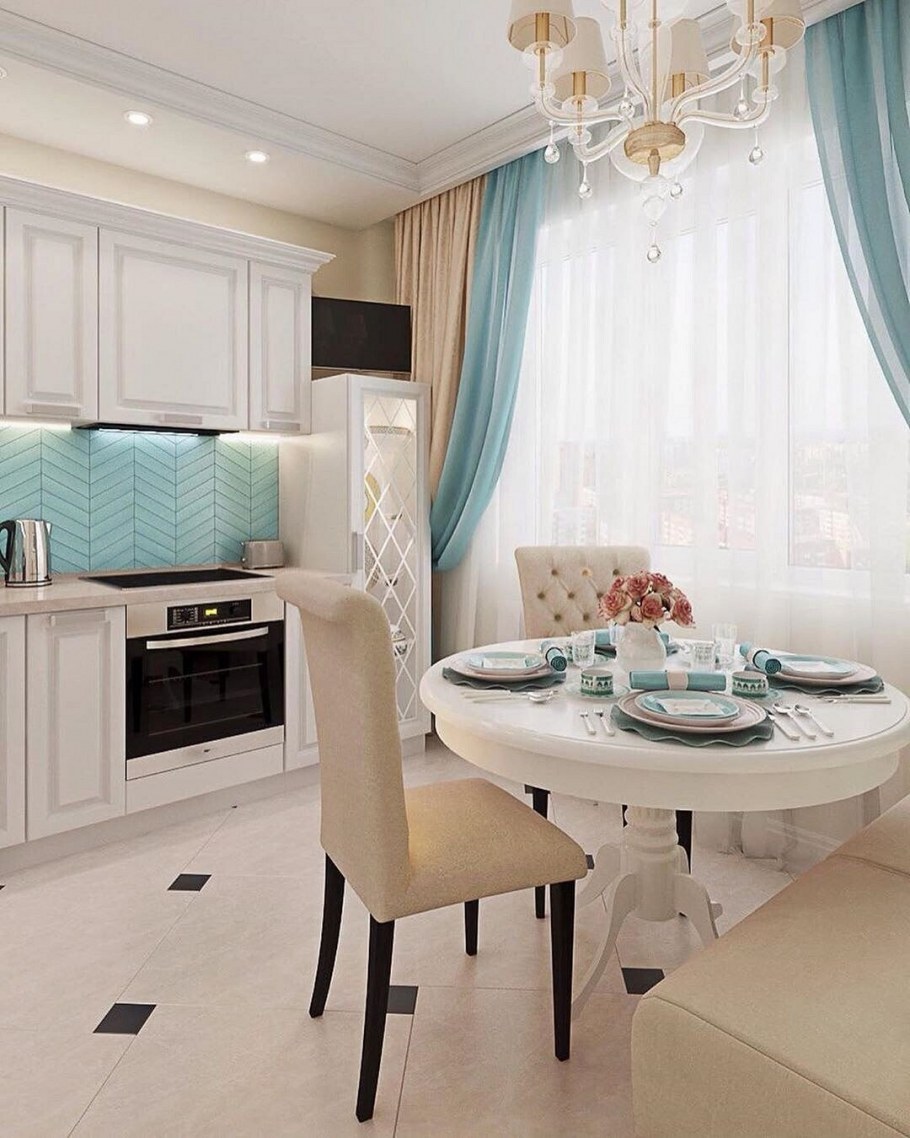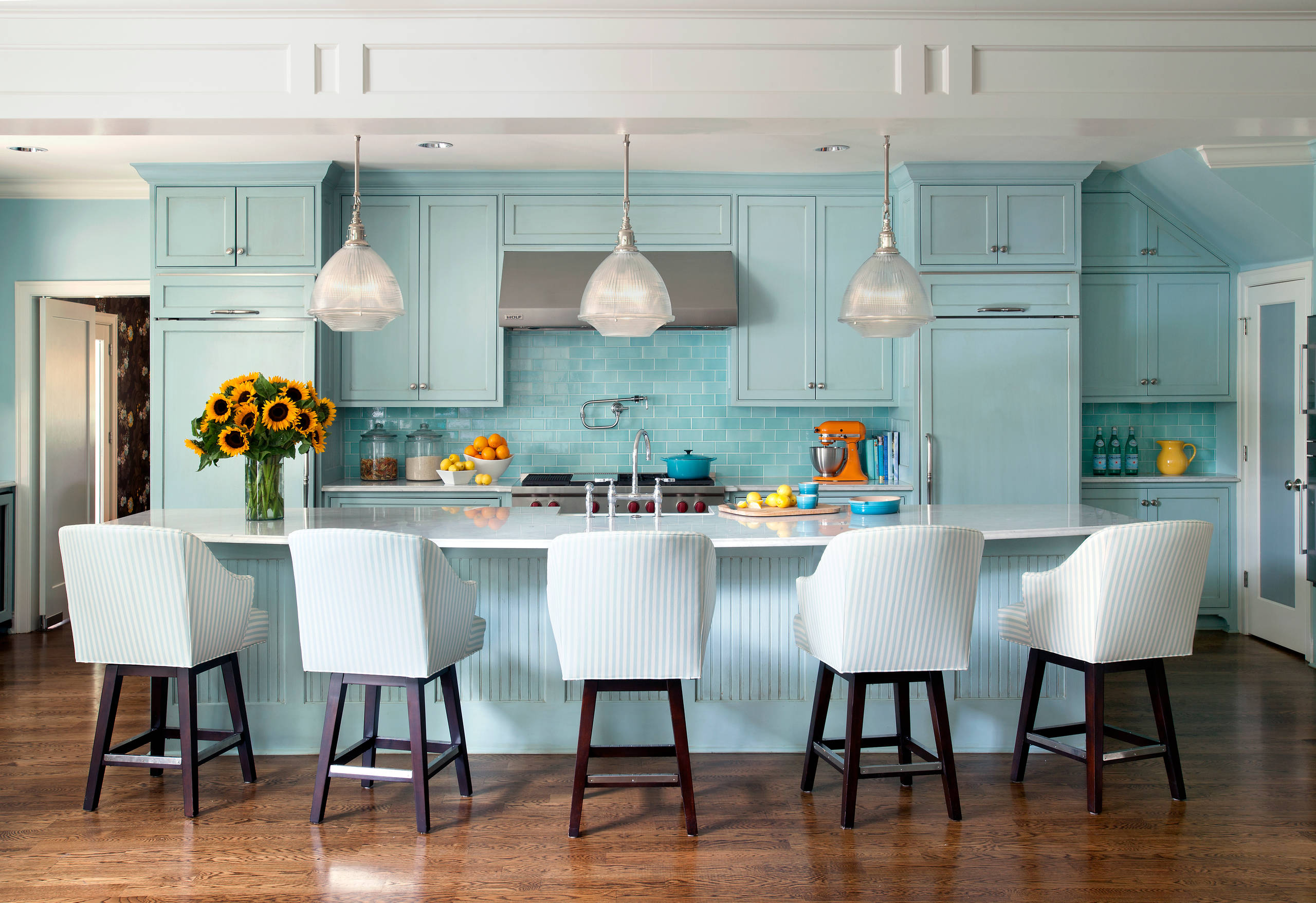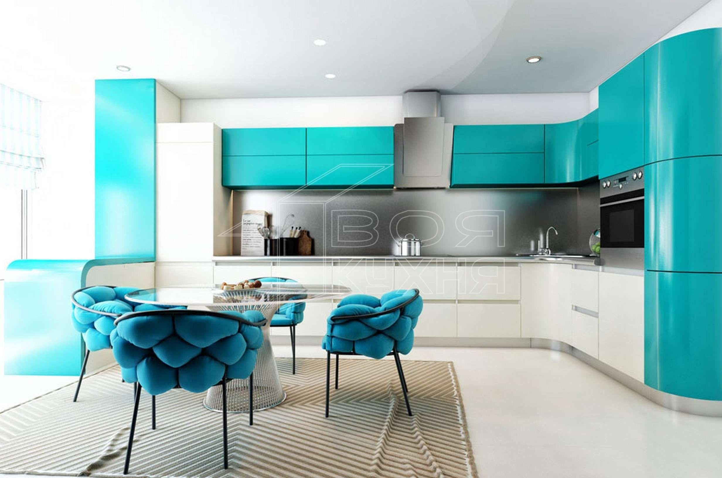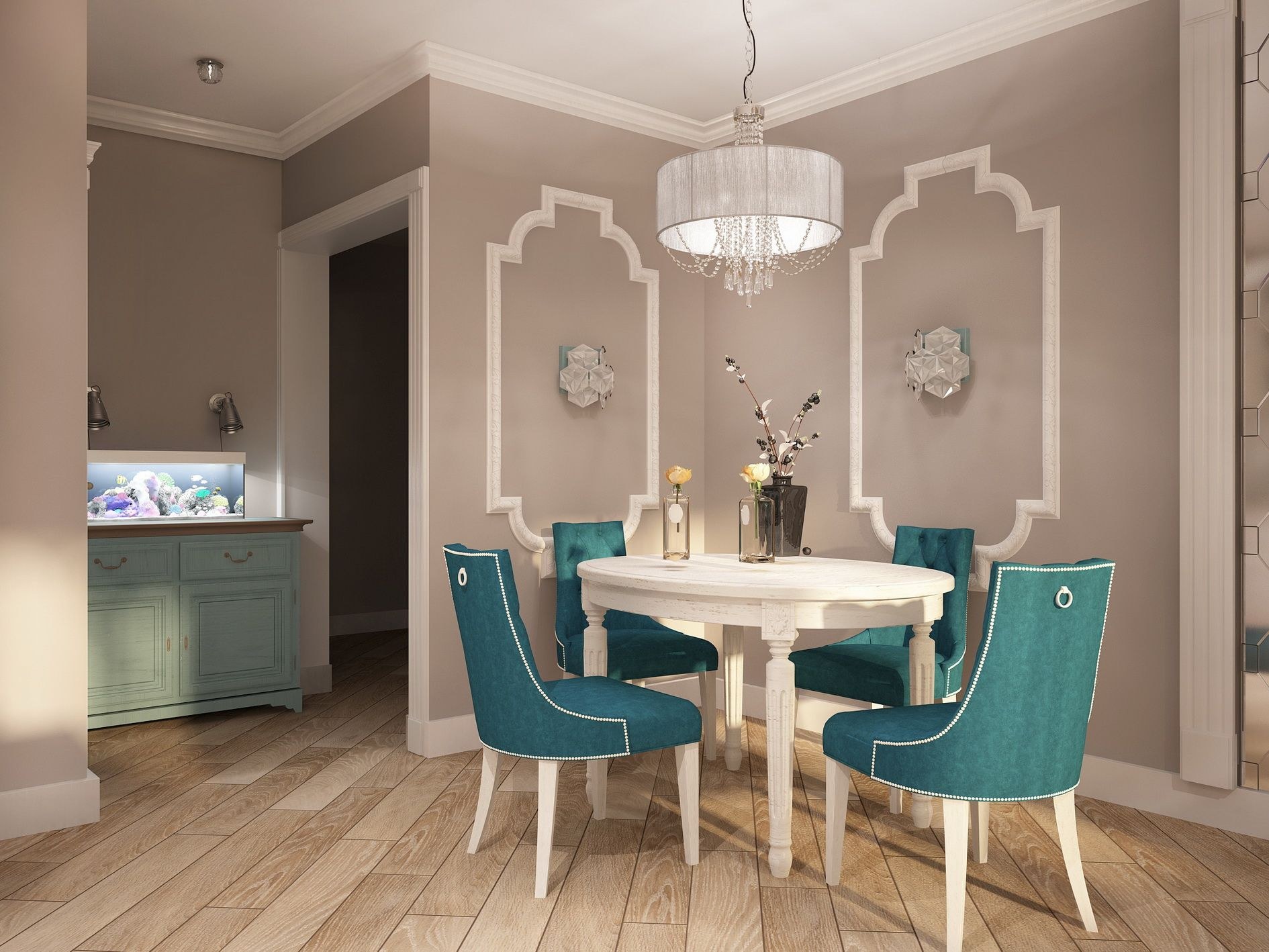 Ярко бирюзовый цвет в кухне с обеденным столом