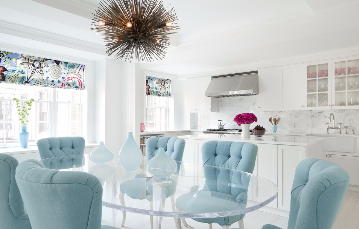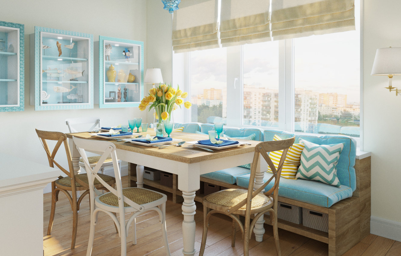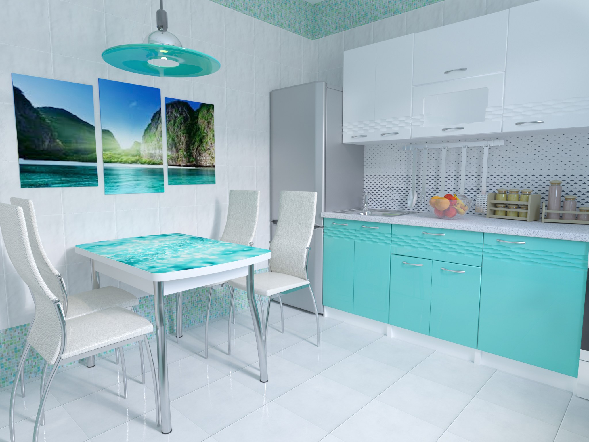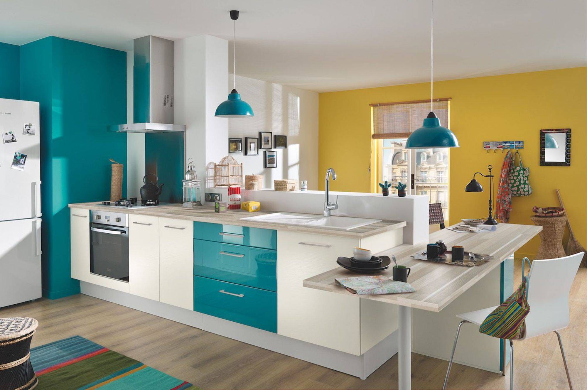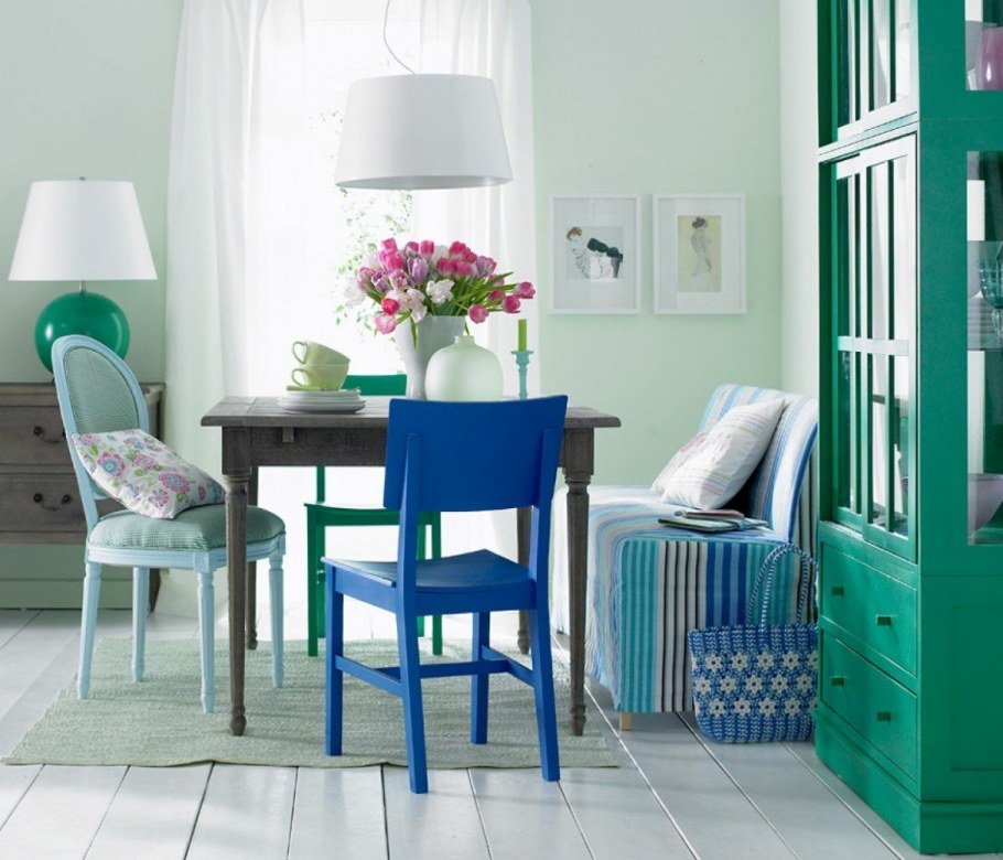 Ярко бирюзовый цвет в кухне с обеденным столом