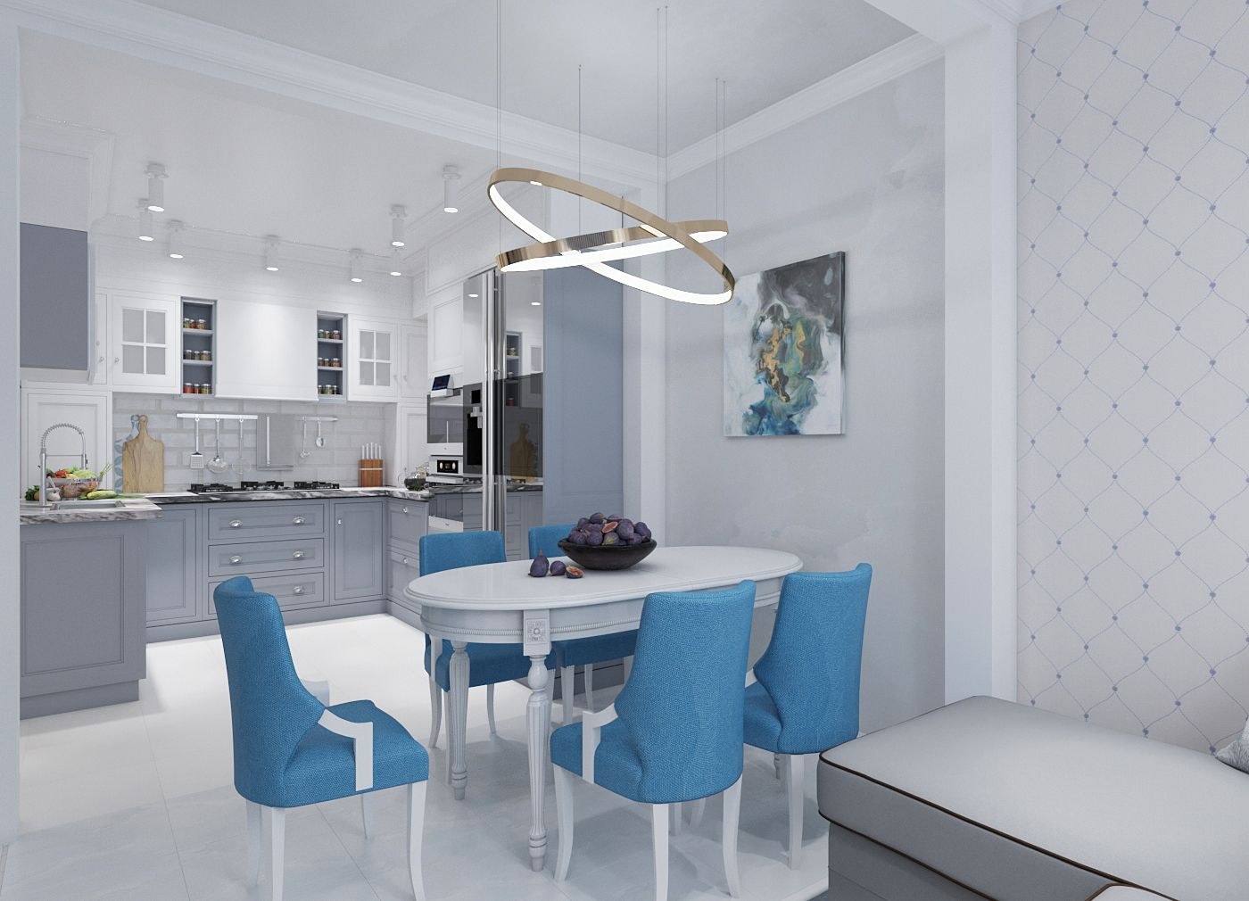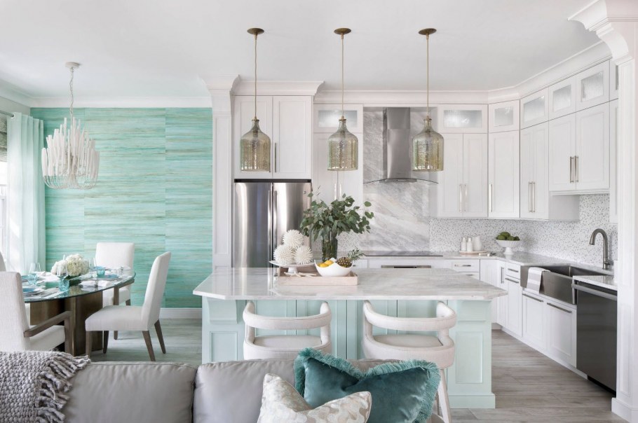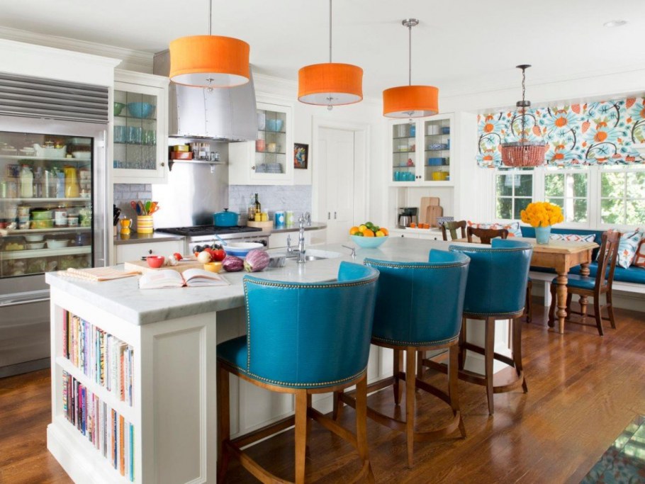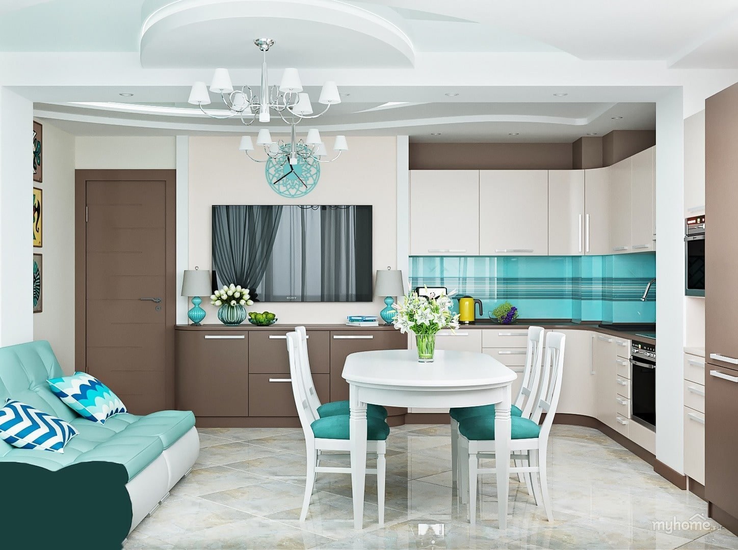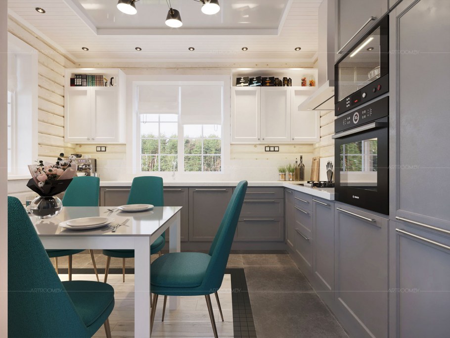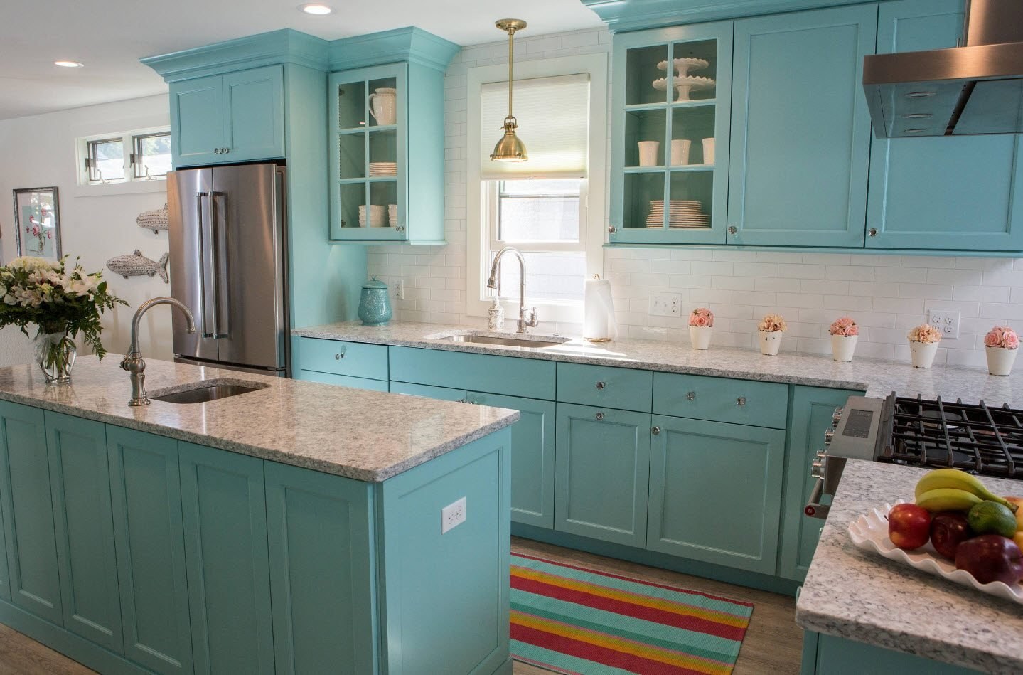 Ярко бирюзовый цвет в кухне с обеденным столом